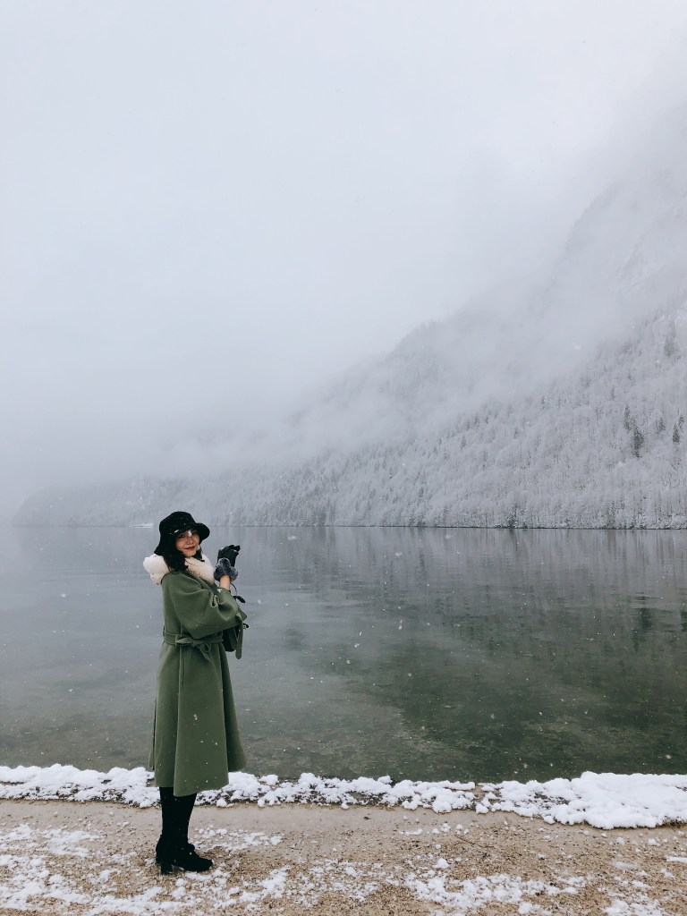 👑聰明用華麗的大衣擋住機能性羽絨衣,貴婦人氣質跟國王湖雪景渾然天成!手套還有一個小貼片是可以以觸控手機螢幕的➡️ 超好用!