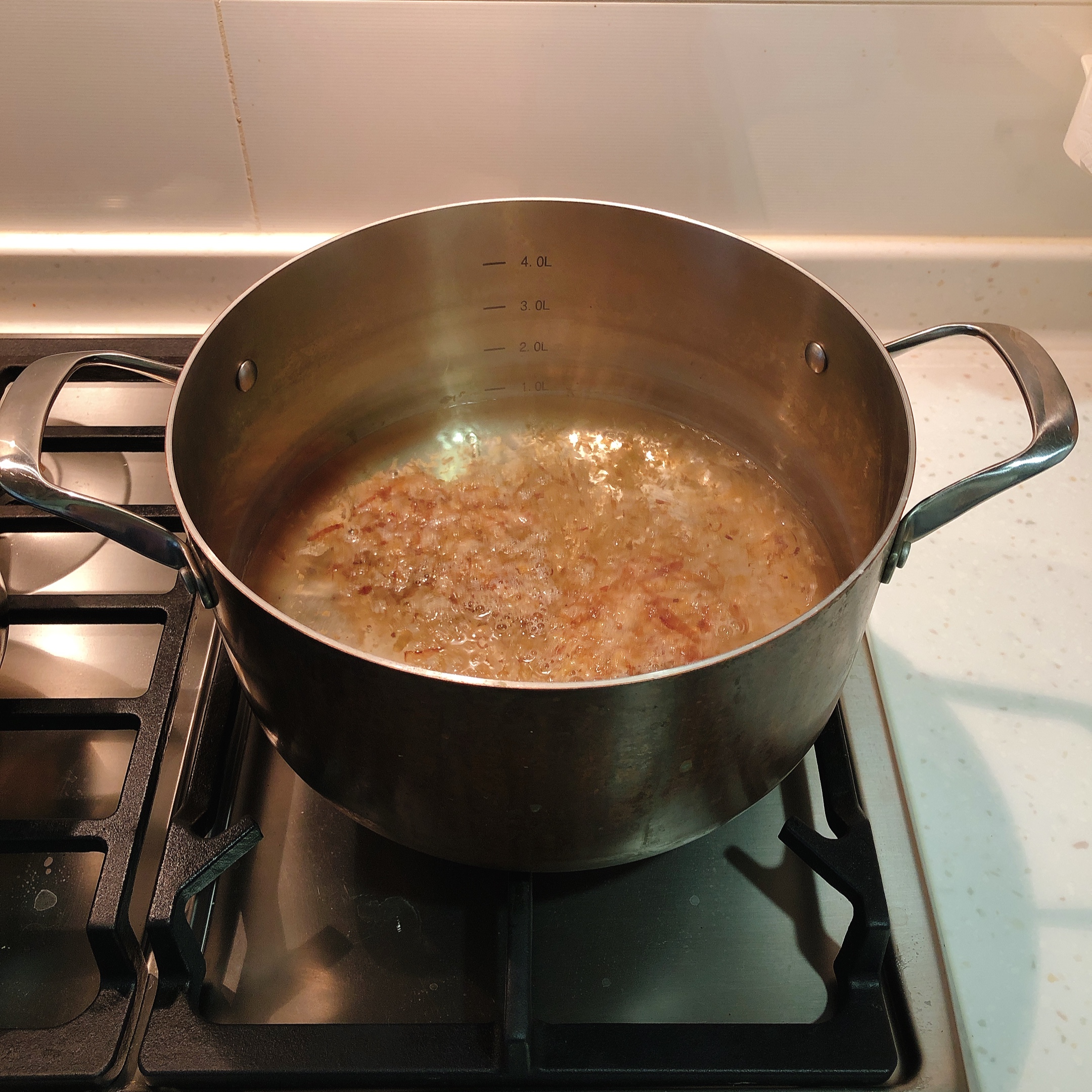 將香菇水加入柴魚片(50g)煮滾後3分鐘熄火,將柴魚片濾掉,清澈的柴魚香菇高湯就完成囉!