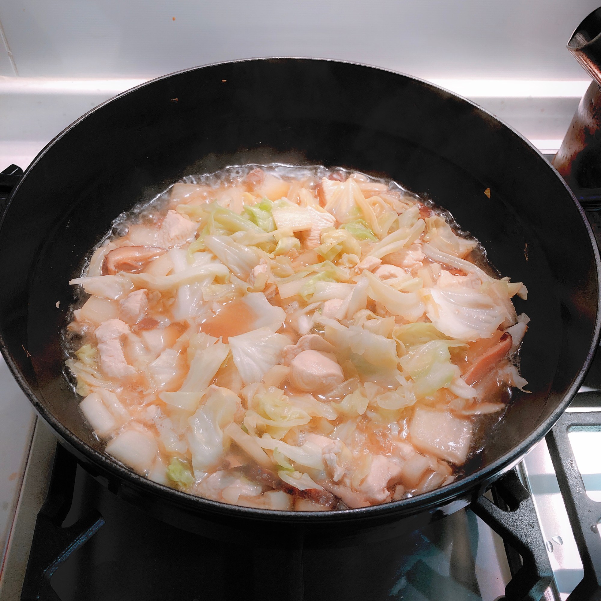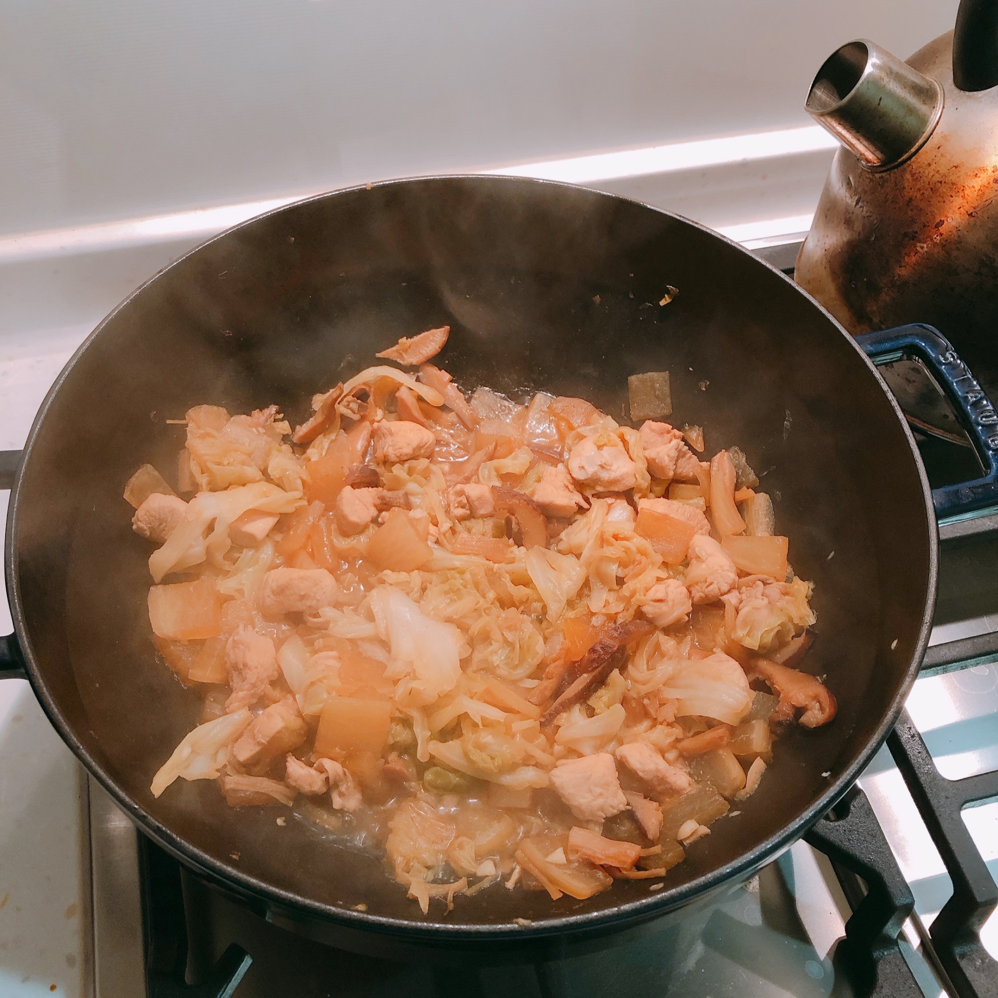 接下來把解凍的雞腿肉切成小塊,雞皮那面朝下放在不沾平底鍋上小火乾煎到油被逼到滋滋作響,放入香菇絲跟雞腿肉塊炒香,再將蔬菜們(紅蘿蔔、白蘿蔔、高麗菜)都扔進鍋裡稍微拌炒後,沿著平底鍋外緣熗下醬油(3大匙)調味拌炒均勻,最後加入事先準備好的香菇柴魚高湯,煨煮到高湯收汁,高麗菜濕料準備完成!