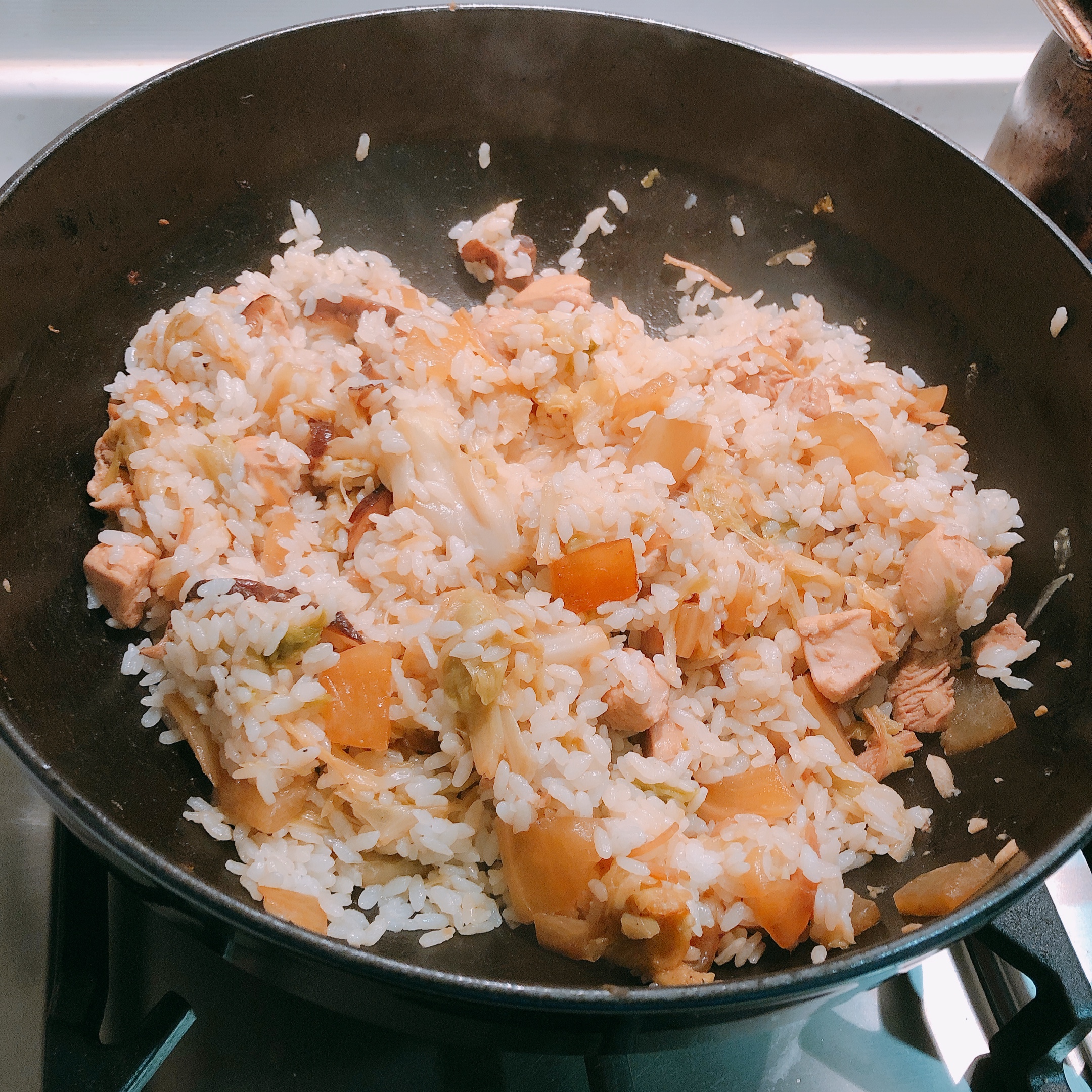 使用隔夜飯的話,可在湯汁尚未完全收汁時加入冷飯拌炒吸收湯汁,煮到米飯粒粒分明吸飽湯汁精華。