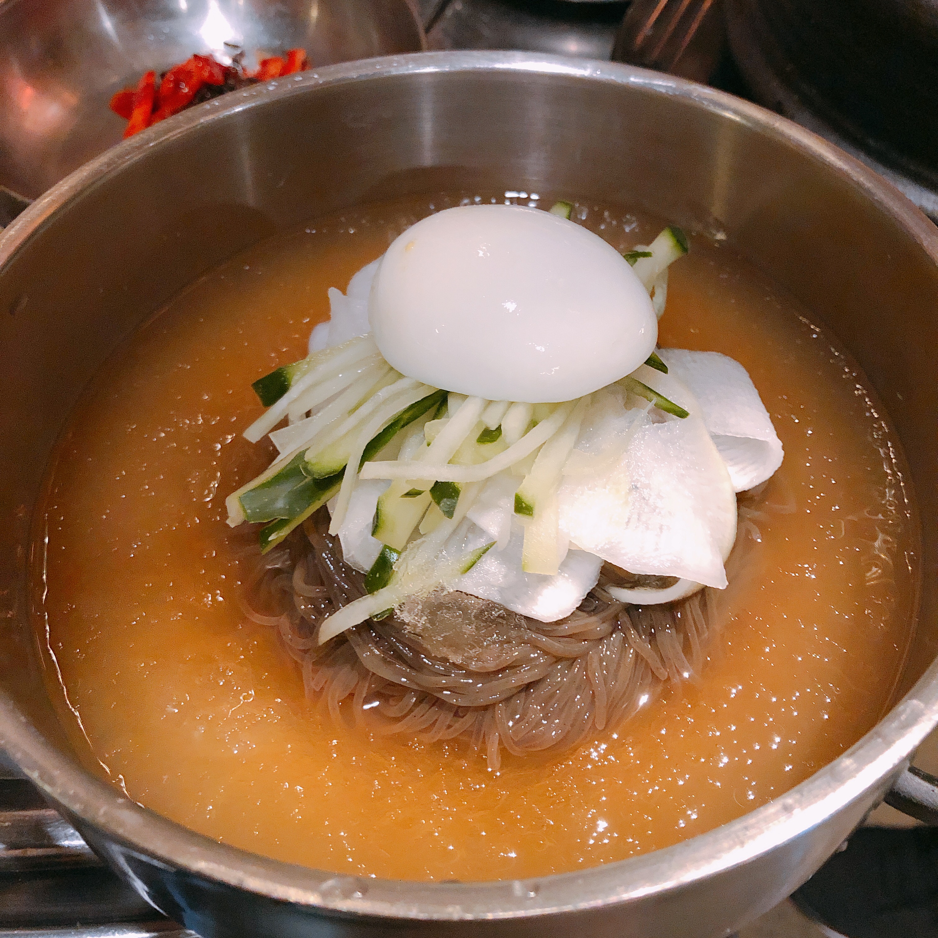 烤肉吃多了,總是會有點膩,這時候來碗冷冰冰的水冷麵解膩最適合了!冷麵的湯汁有水果醋提味,搭配小黃瓜以及醃蘿蔔,吸入一口麵,好滿足👼