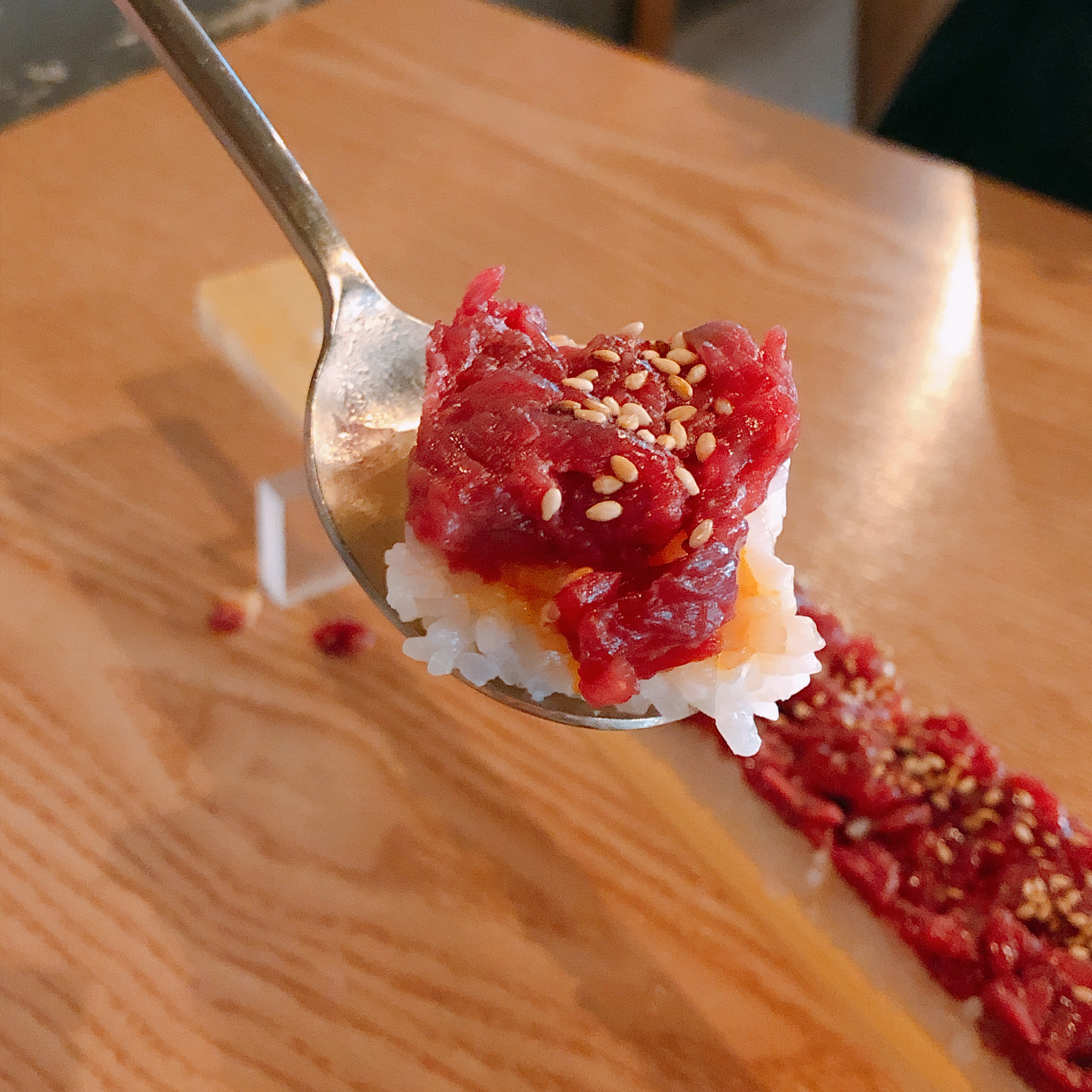 原本米飛對於吃生牛肉這件事情本身,就充滿了各種問號❓畢竟,牛肉就是要外面焦焦但裡面三分熟才好啊!但實在太好奇韓牛壽司是怎麼一回事,所以,把這個小點心概念的食物(無法當正餐又單價有點高的零食)安排在食慾不振的初夏下午剛剛好。