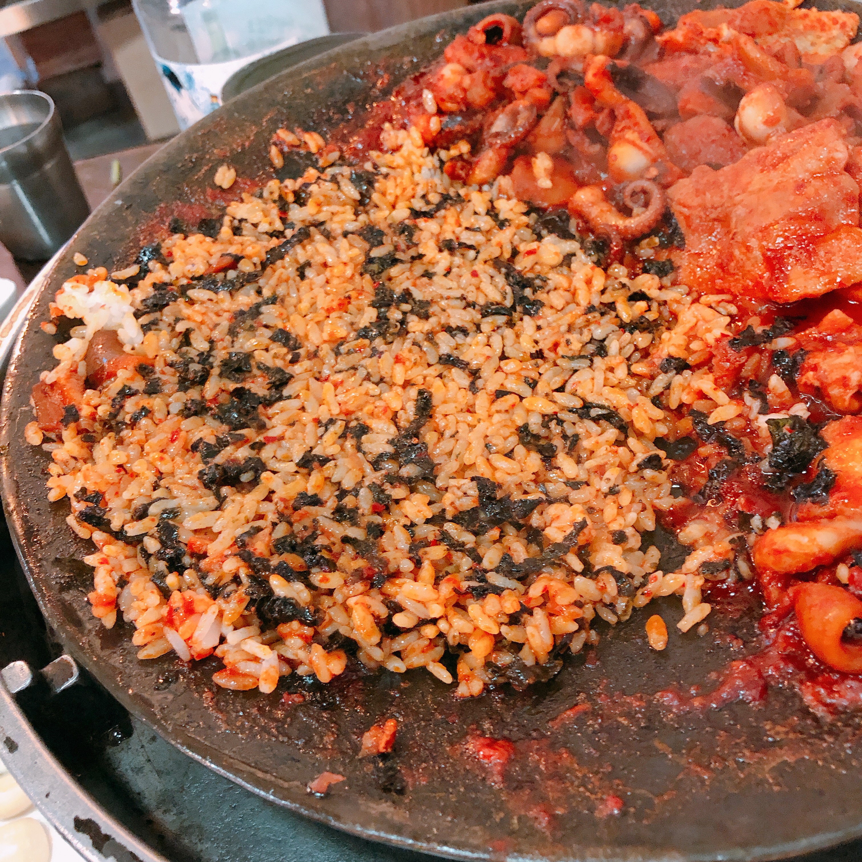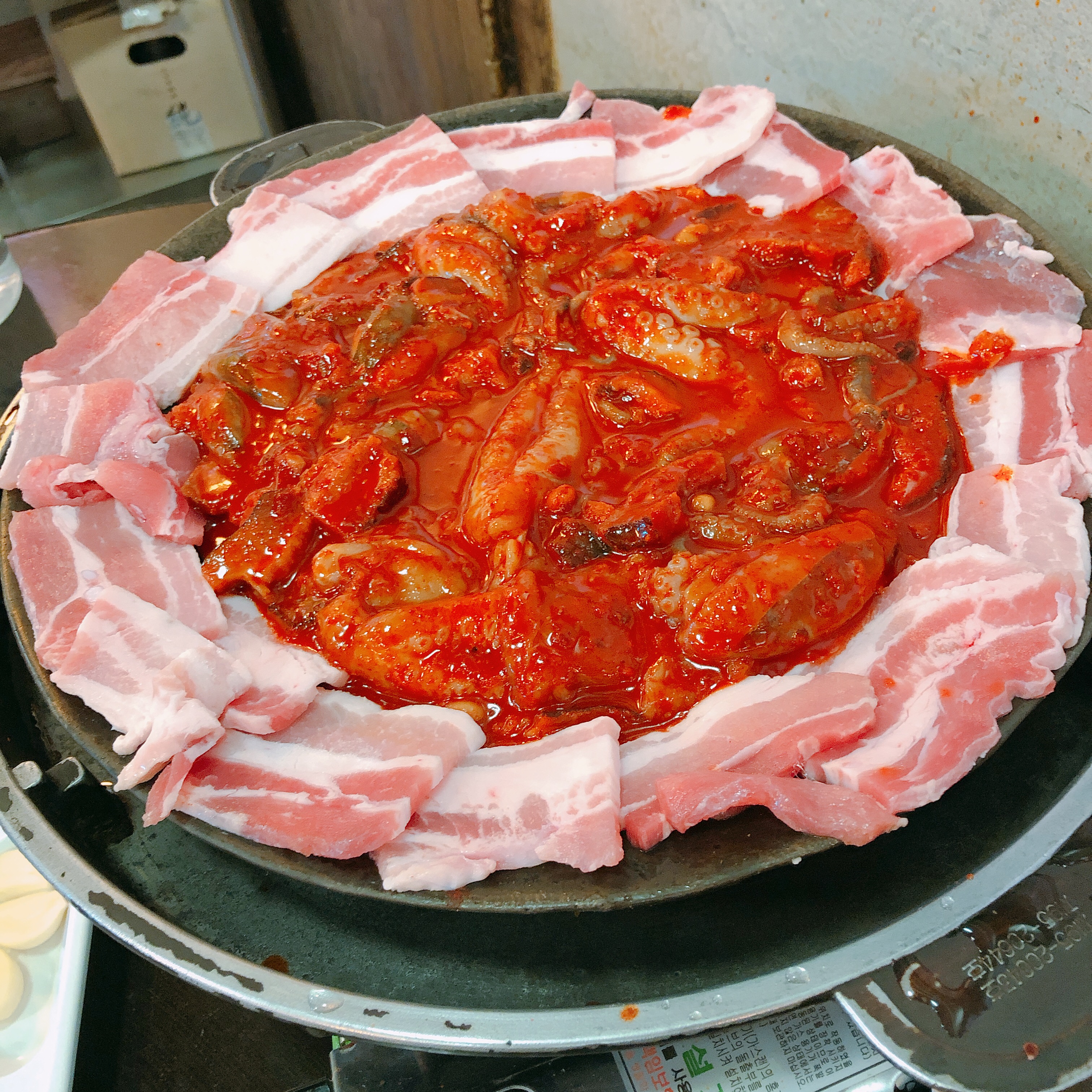畢竟一般在台灣吃到的韓式辣炒章魚,大多都是小外星人章魚,米飛沒有太愛(因為總覺得章魚頭部直接在嘴中爆開很噁心)。但哈哈推薦的號稱「只有沒吃過的狎鷗亭人,沒有只吃過一次的狎鷗亭人」的船笛(뱃고동)是大章魚支解後去炒的,看起來真的辣度滿點美味度爆表!可是~~~米飛又不是藝人,沒事不會晃去狎鷗亭站那邊(畢竟,K star Road已經去2次了),所以同樣要求半獸人夫君同樣在弘大11路公車🚶♀️可到達範圍搜尋,就找到幾乎沒什麼部落客寫、客人都是韓國人、服務員幾乎不說英文也沒有中文菜單的校洞家。