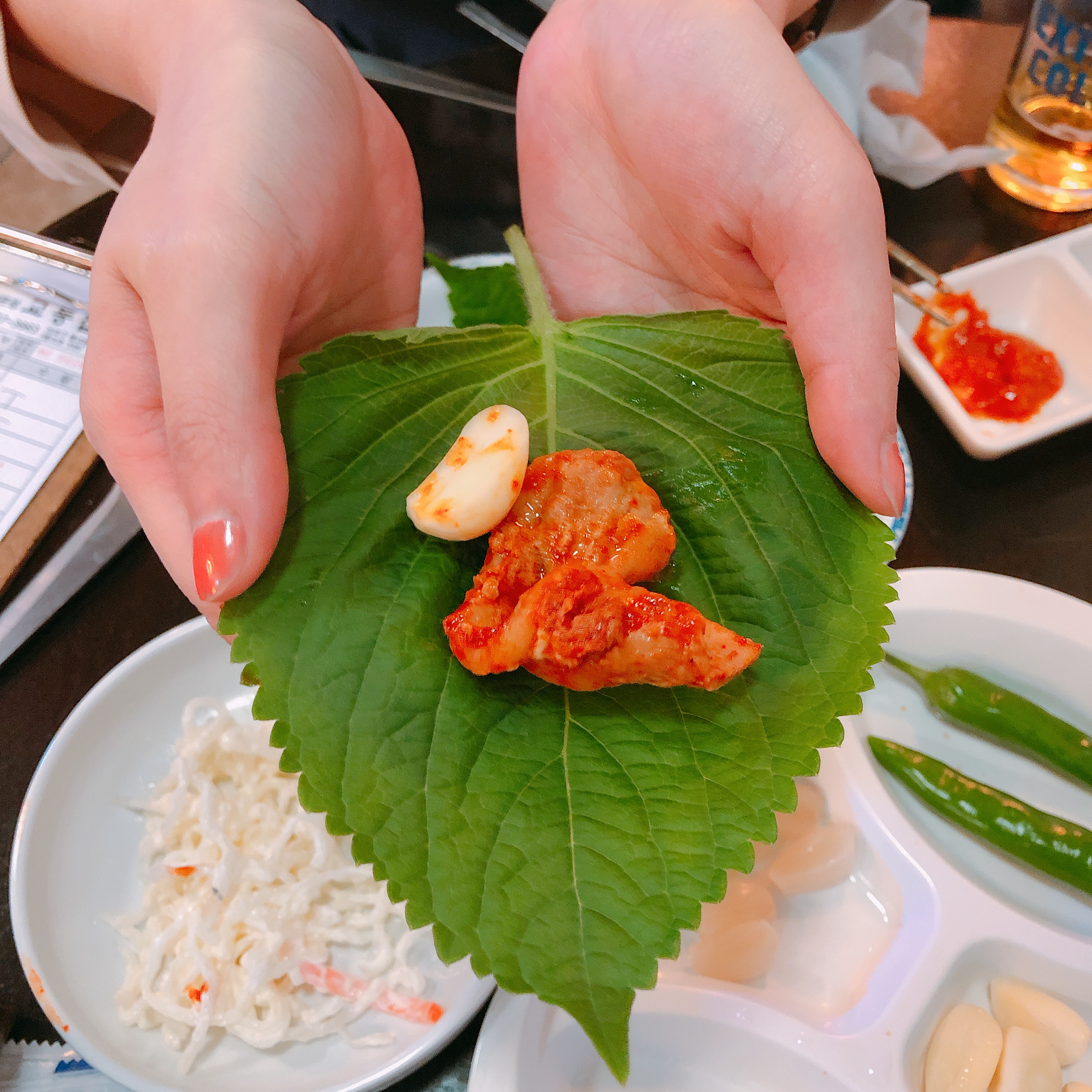 再來就是發揮菜包肉的精神,隨意混搭。細心的大叔(即使現場多出了5組客人,但仍然記得米飛喜歡海苔、半獸人夫君喜歡烤蒜頭),發現我們突然停下筷子,就立刻從外面衝進來,繼續幫我們烤海苔跟蒜頭,好窩心喔!