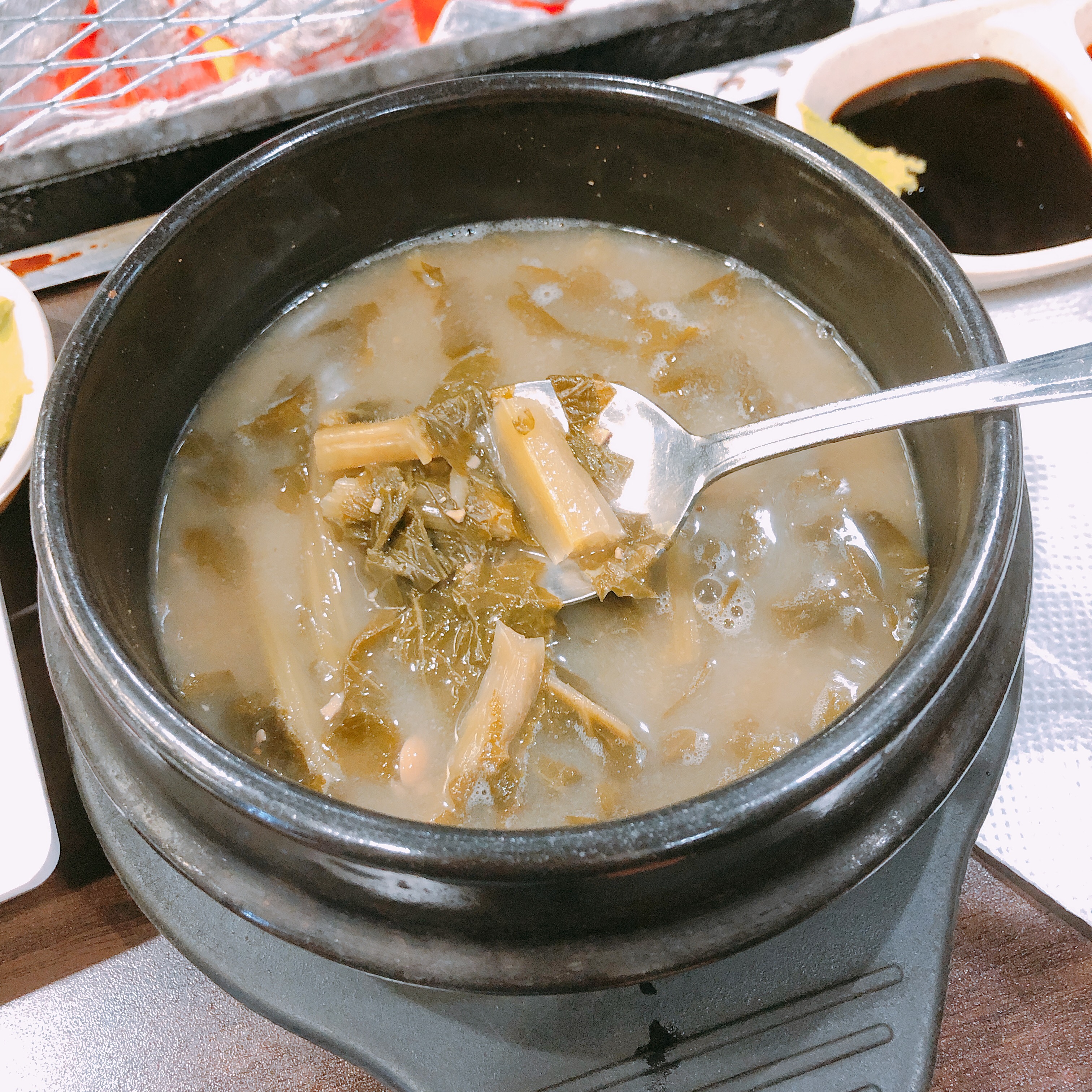 米飛雖然是吃貨,但因為只有兩個人,所以,我們很安分地只有烤五花肉(一個鹽味、一個特殊醃料)、大腸、水冷麵還有泡菜湯!➡️ 但其實還是吃到超撐😂
