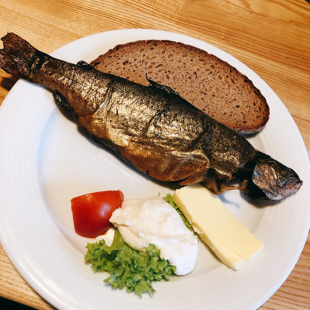 拋開煙燻偏見,吃了第一口煙燻鱒魚。心得是:沒有想像中的那麼鹹,但完全不知道為什麼可以成為特色料理呢!不過,搭配爽口的啤酒,燻鱒魚瞬間就美味度提升100倍啊!(果然是沈溺在酒精裡的女子😳)