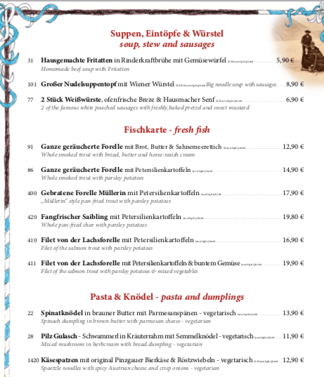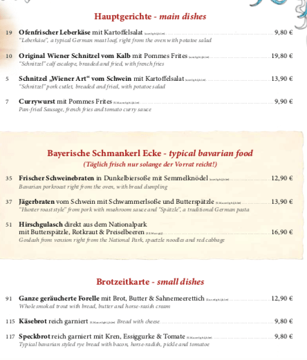 其實,米飛根本德文能力0,不過,觀光區餐廳的菜單,都非常人性化地有英文註解。而且,雖然說主菜都有制式的配菜(side dish)但其實,也可以加1.9歐元換購綜合野菜沙拉喔!再不然,也都有編號,真的連英文都不行的旅人,就吃經典定番:烤鱒魚/烤鮭魚吧!😂😂😂