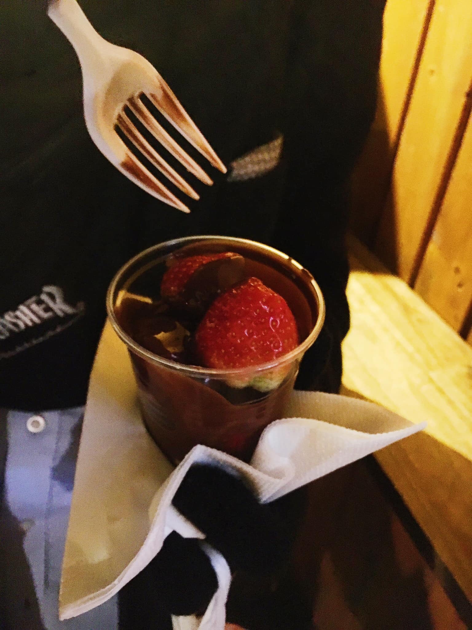 菜單上有各式各樣的水果(香蕉4歐、草莓6歐,也可以混搭)、棉花糖(4歐)、花生泡芙(5歐)、或餅乾(5歐)可以選擇沾著巧克力吃。