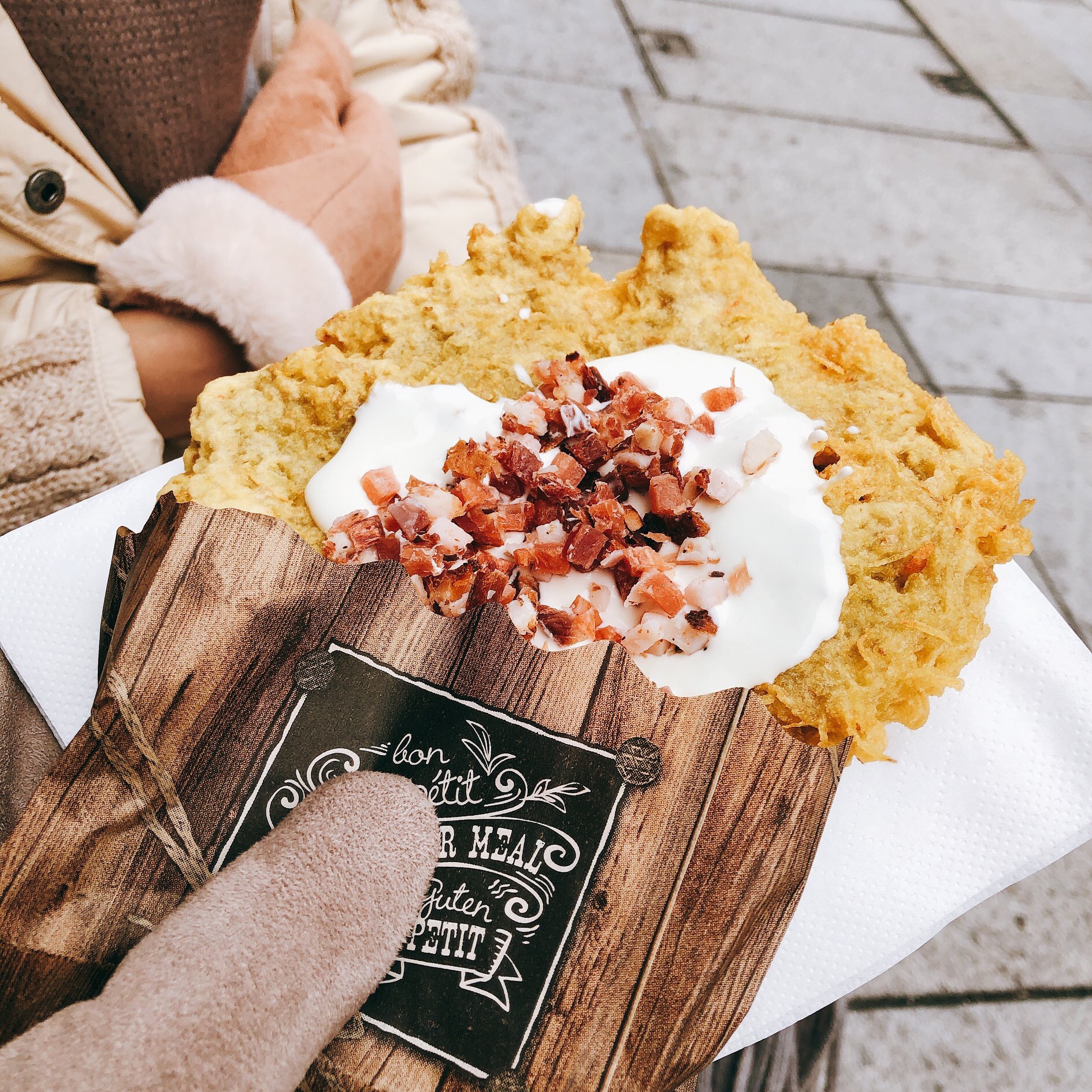 不同於油膩膩的Langos ,這個奇妙的食物,吃起來口感有點像炸甜不辣,搭配酸奶跟培根,熱呼呼的吃,好幸福☺️