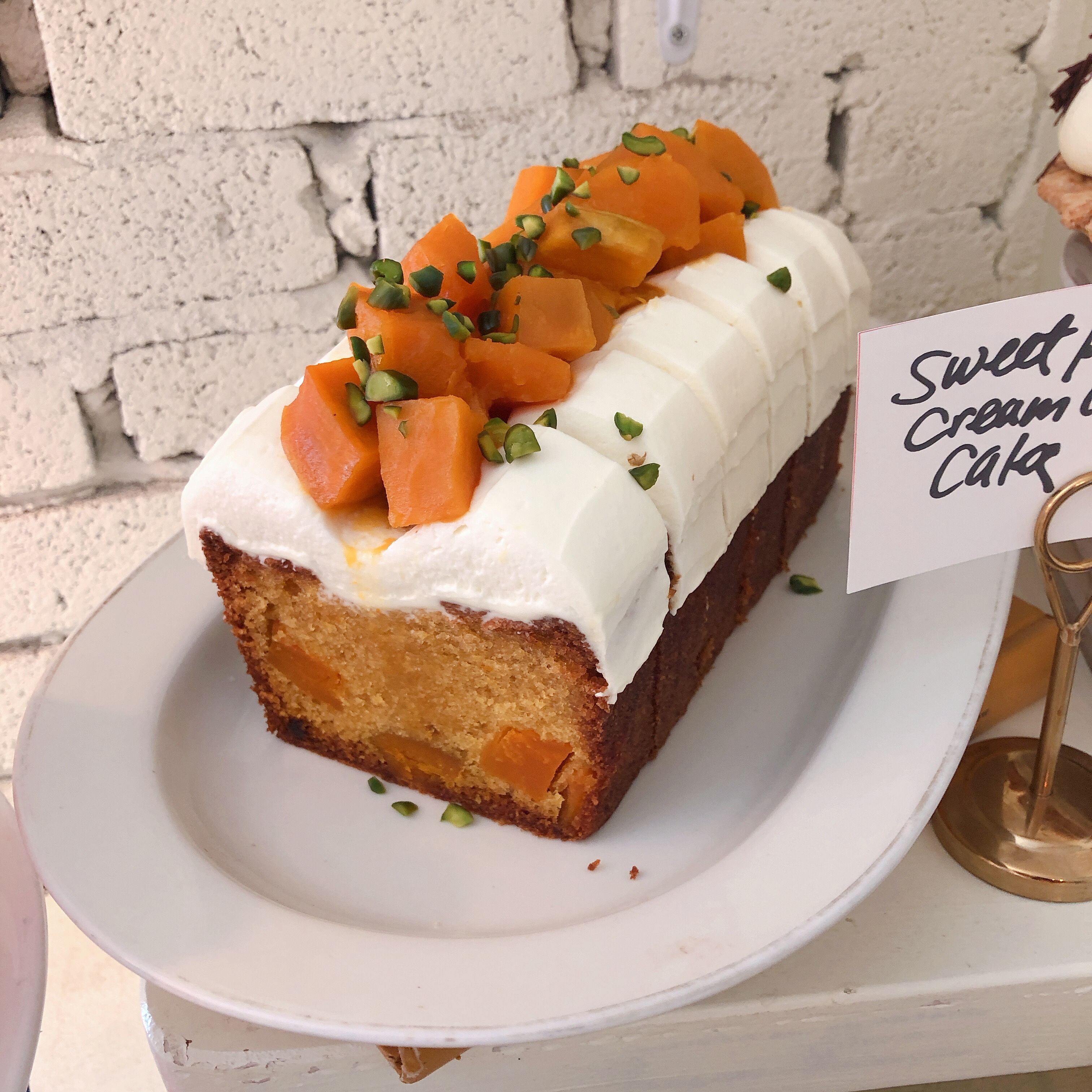 還有被厚厚的白雪鮮奶油覆蓋的南瓜磅蛋糕,上面還有焦糖化的南瓜糖果耶~~~上面還灑了南瓜籽碎碎,一整個誘人啊!