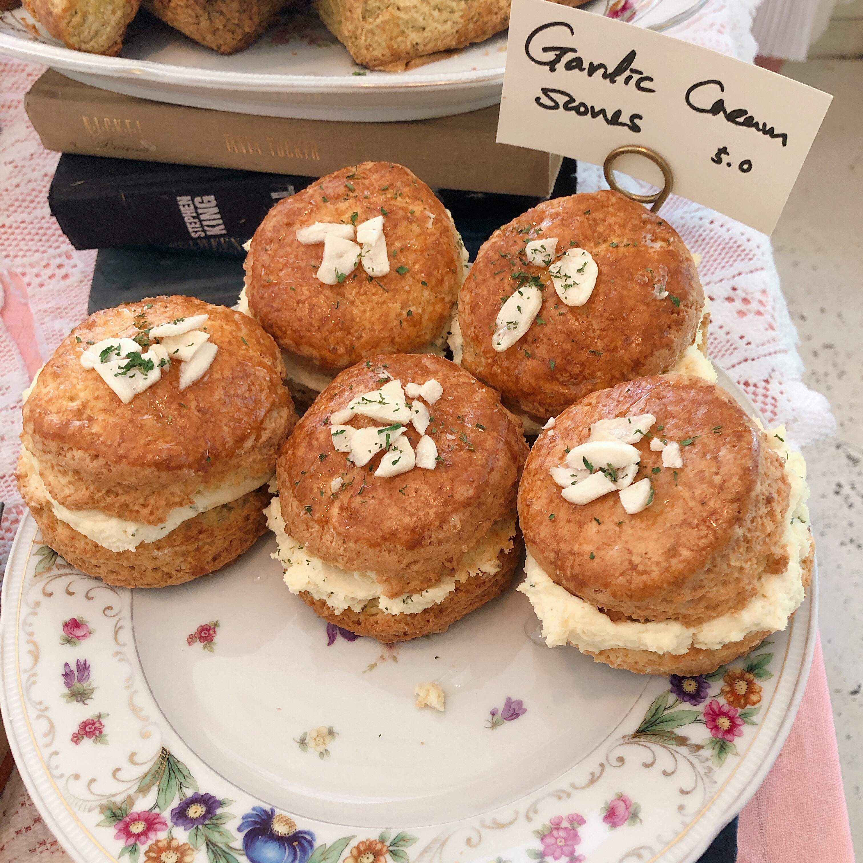 酥脆的司康,搭配鹹奶油抹醬以及蒜片,立刻激起強大食慾。