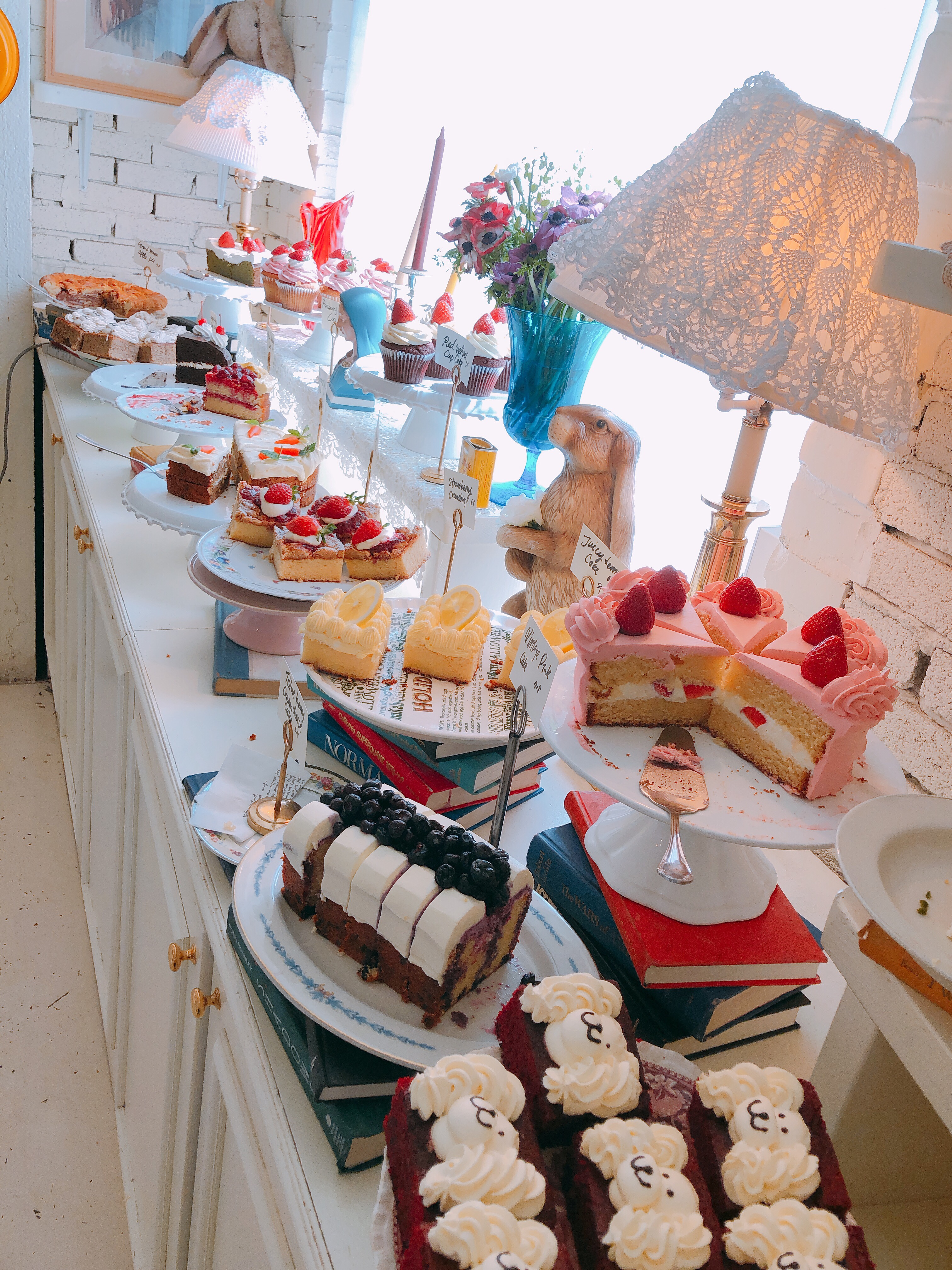 靠窗的櫃子則是放蛋糕或水果派為主,蛋糕盤用書籍📚堆疊製造出視覺層次真的是很聰明的空間設計。