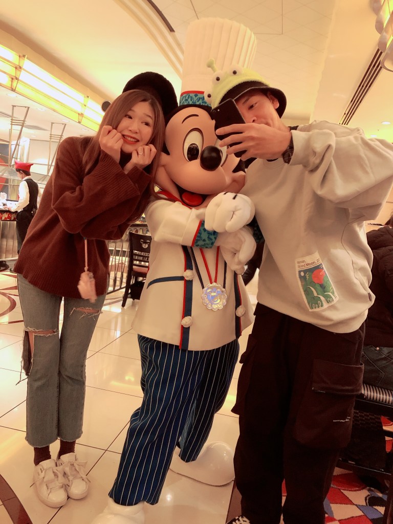 米飛:(跟米奇拍照擁抱後,美味自動放大100倍)超級好吃😋 ➡️ 明明是個才剛吃一口沙拉的人