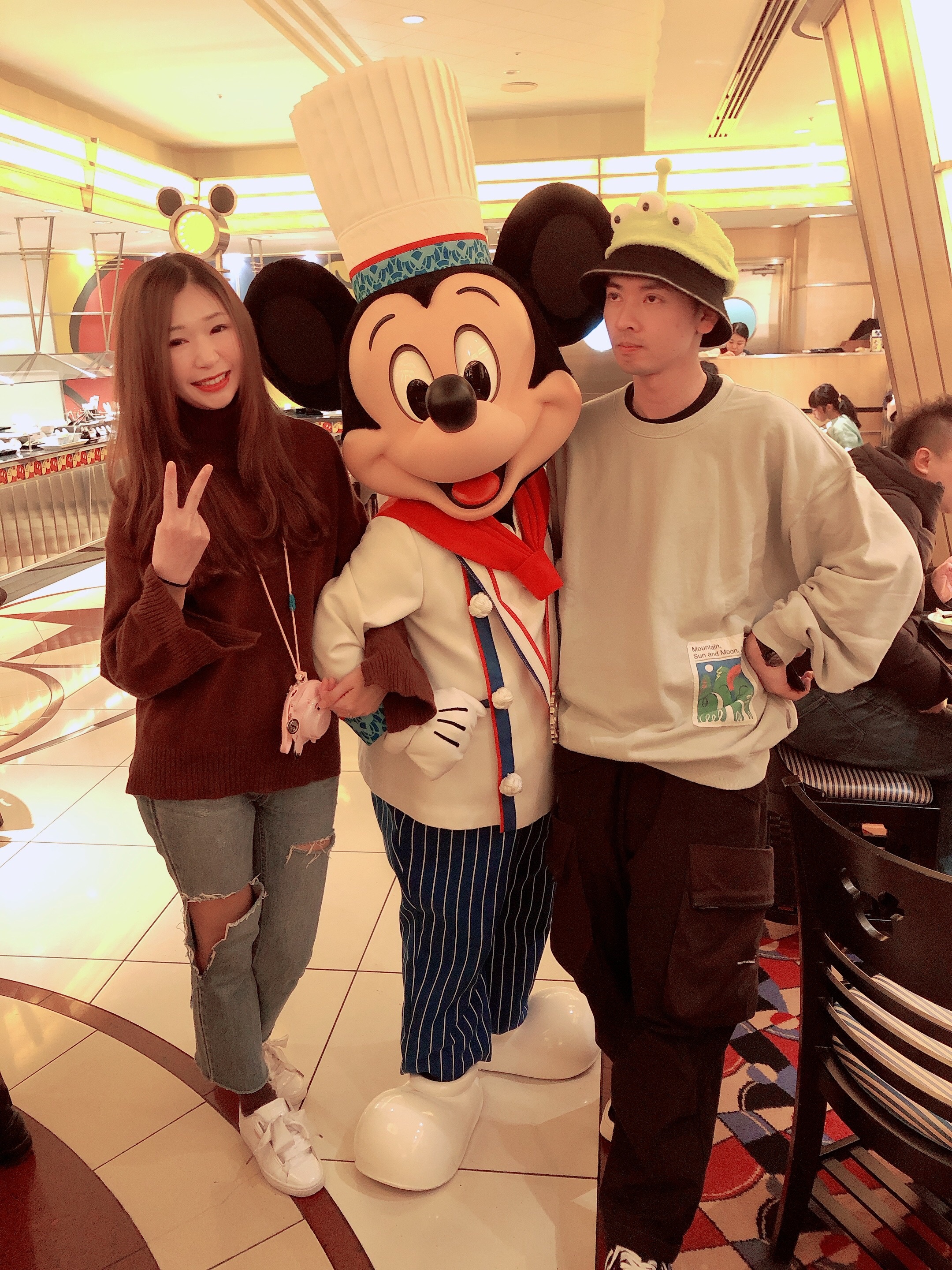 這時候,旁邊的攝影師會同時引導你跟餐廳背板拍照。如果沒有要購買背板照,也可以直接表示不需要,服務生就會詢問房號並且在米奇公仔沙發區等候帶領入席。