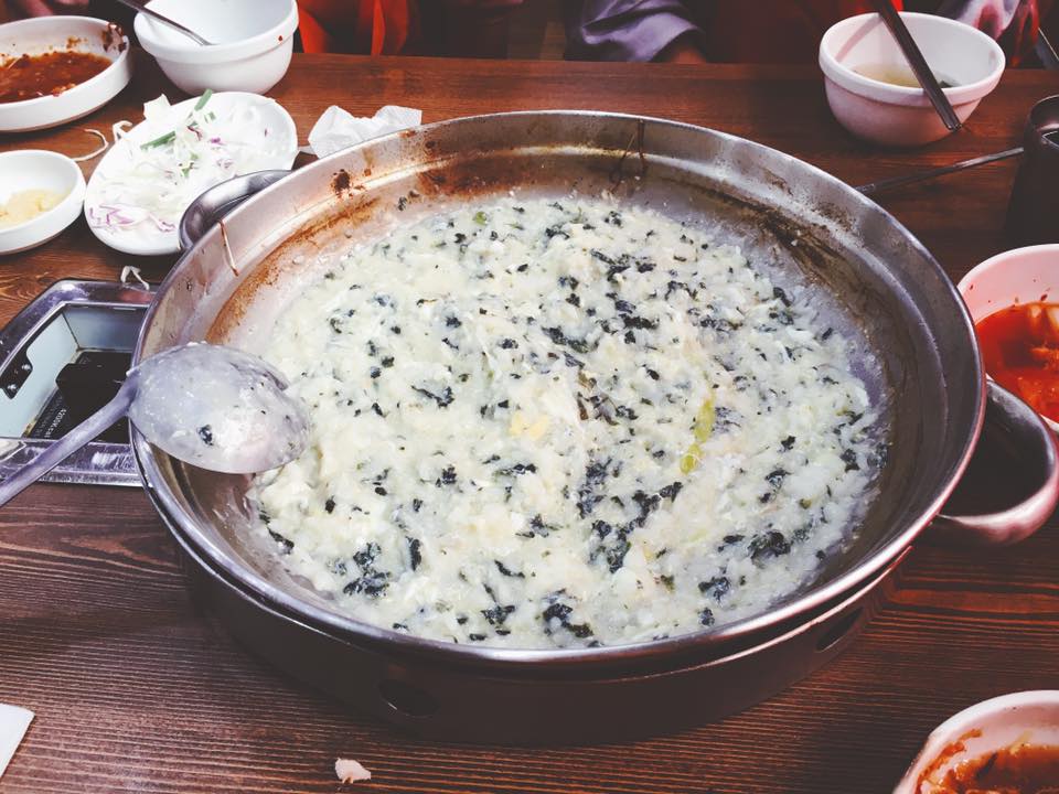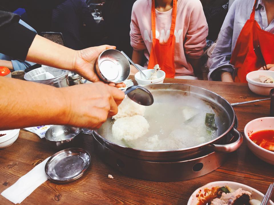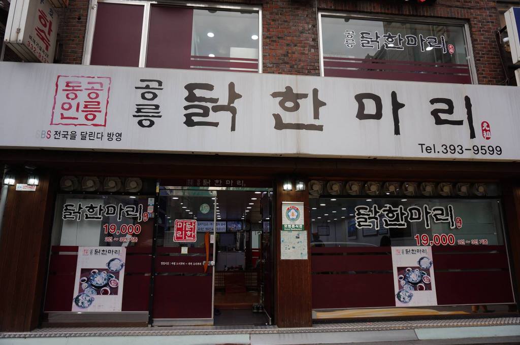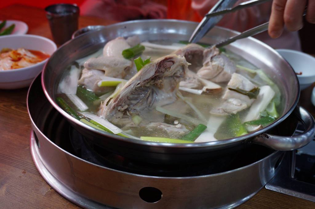 一隻雞不囉唆,就是把一整隻雞(不調味)直接在美味的湯汁裡煮,沾著醬汁,配著生的青陽辣椒、泡菜一起吃。吃到最後,可以選擇加飯、雞蛋跟海苔做成美味的粥,或是加入刀削麵,跟日本火鍋的吃法有點像,就是一鍋無比美味的雞料理!