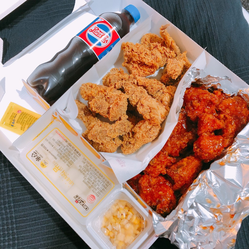 韓國的炸雞店外送盒都超精美的!讓炸雞、配料(醃蘿蔔、玉米粒這類的)還有贈送的可樂,安穩地住在改裝過的pizza盒,送到你面前都還是熱的!