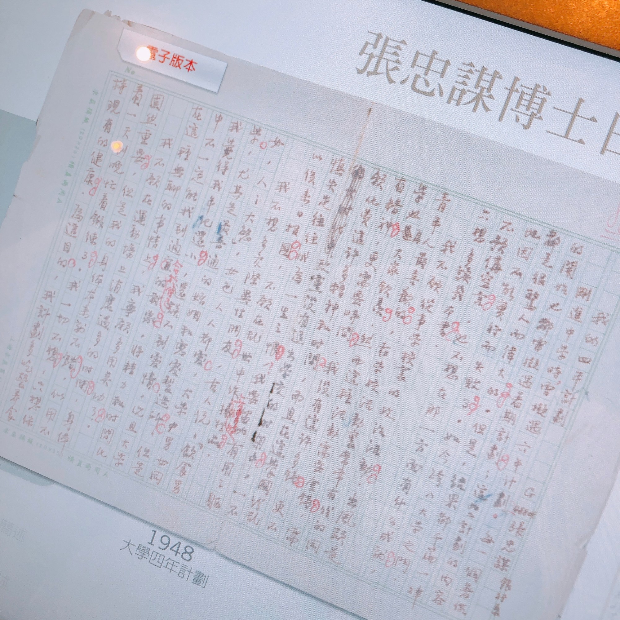 電子展示螢幕可點選許多不同關於Morris人生每個階段的文字資料,這則《大學四年計畫》讓人一窺二戰時期菁英知識份子追尋美國夢的自我期許,某個程度上也稍微可觀察其強烈的人格特質。