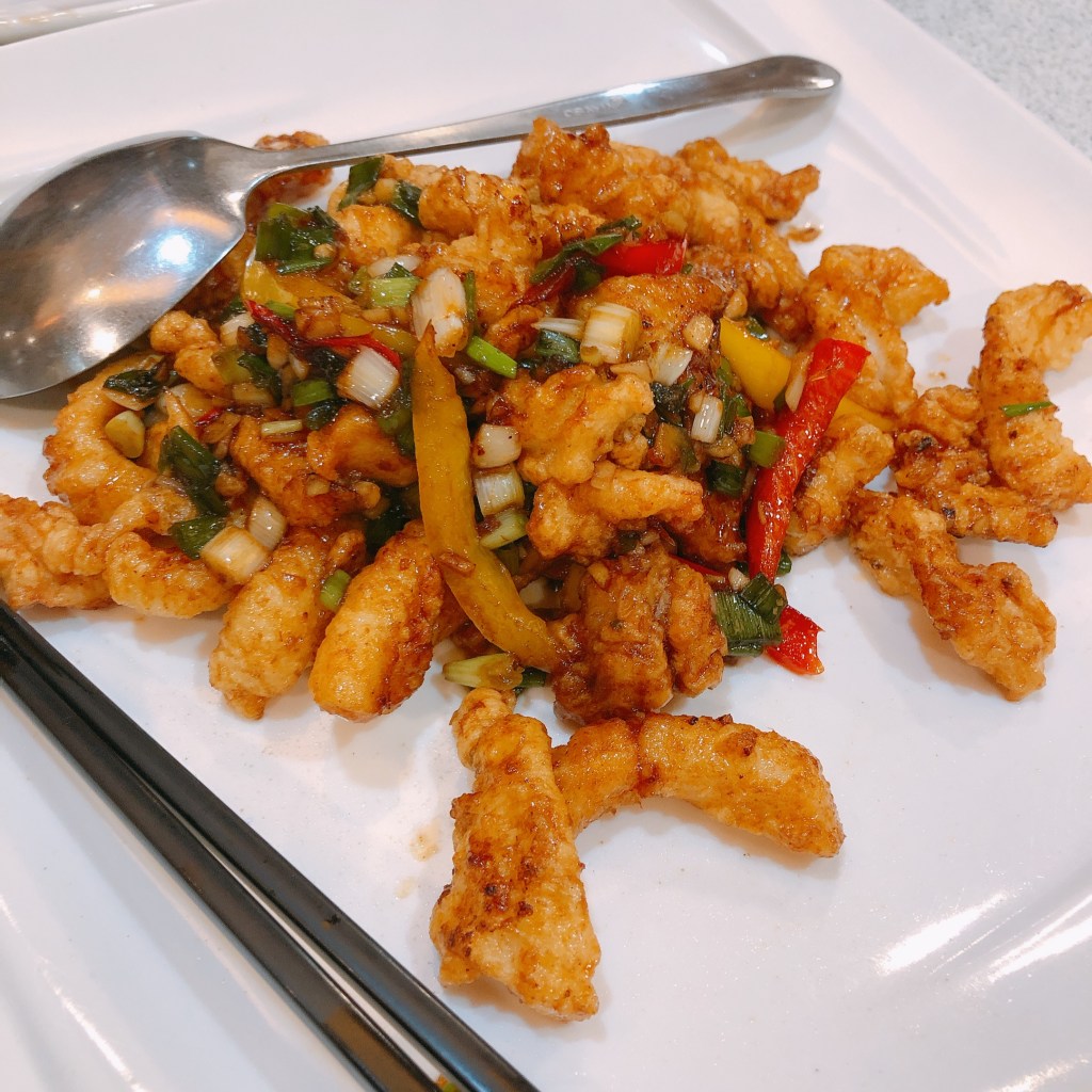 另一道洋炒花枝,雖說是「炒」但其實是將新鮮的花枝裹粉炸到酥脆,再大火將洋蔥、青蔥、紅黃椒拌以醬汁快炒炸花枝。