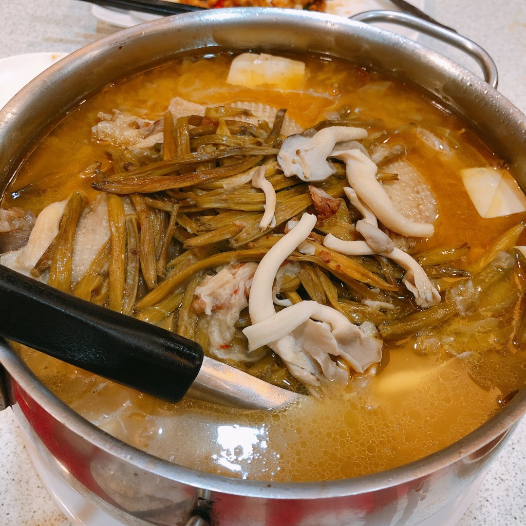 整隻鴨子以扁魚、白菜、乾貨金針慢火熬煮鴨肉的鮮美,再加上新鮮菇類、鵪鶉蛋及凍豆腐,濃郁的湯及燉至軟嫩的鴨肉,是最棒的解酒湯。