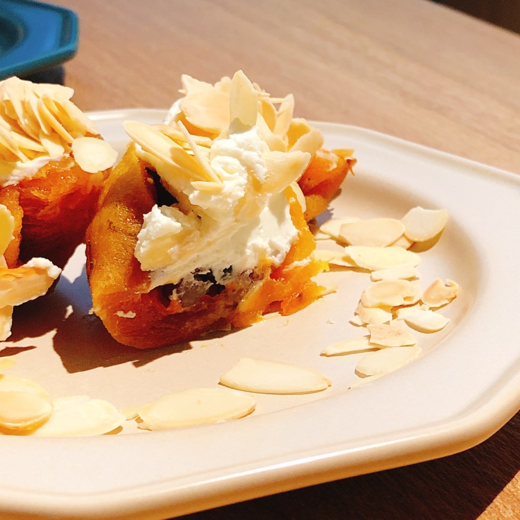 橘橘的柿餅坐在樸素的瓷盤上,鬆軟的馬斯卡彭是柿餅的全新假髮,上面還撒滿脆脆的杏仁片,柿餅的內餡是綿密的紅豆泥,馬斯卡彭奶油調節柿餅與紅豆的甜,是恰到好處甜甜的幸福感。