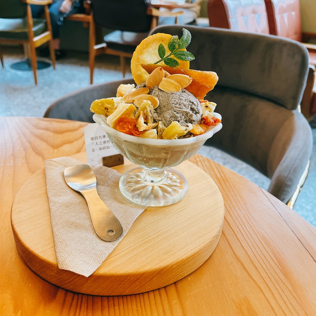 輕盈的玻璃因為樸實的刻痕營造厚實感,自製芝麻冰淇淋撒上綜合果乾,很不義大利的風味,有種阿嬤早上泡的芝麻糊撒上果乾幻覺,童心未泯的長輩一定會熱愛這種口味。