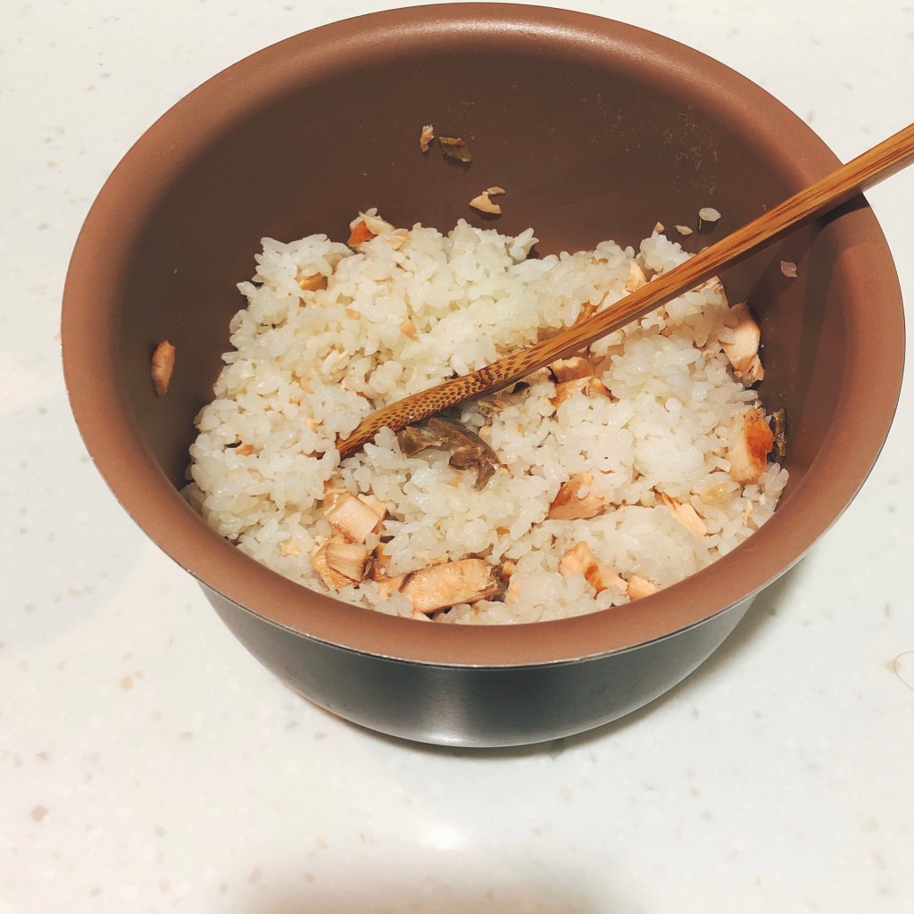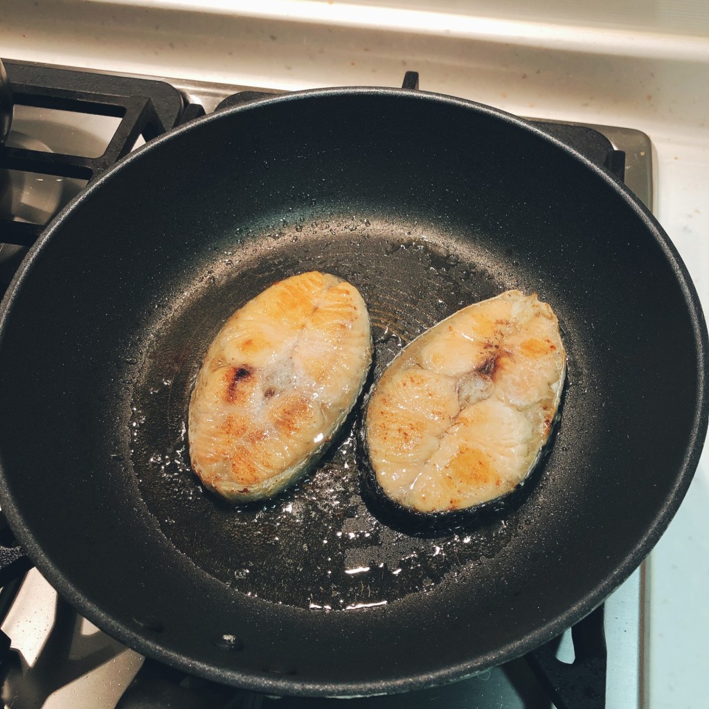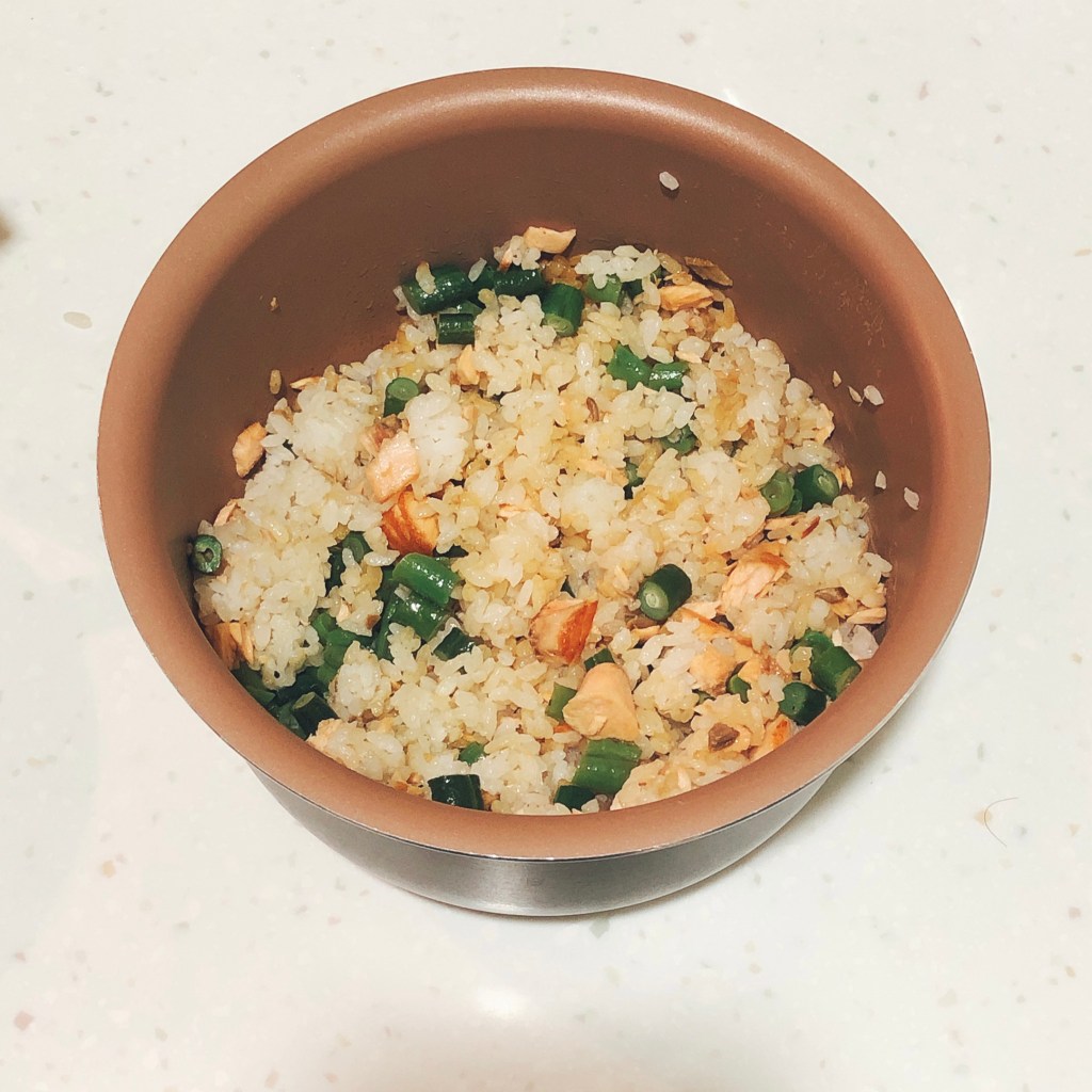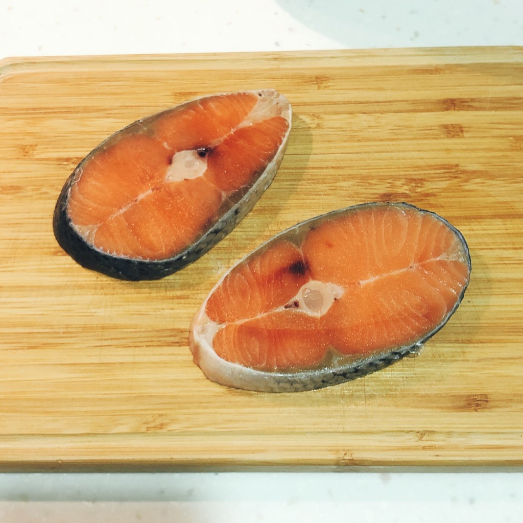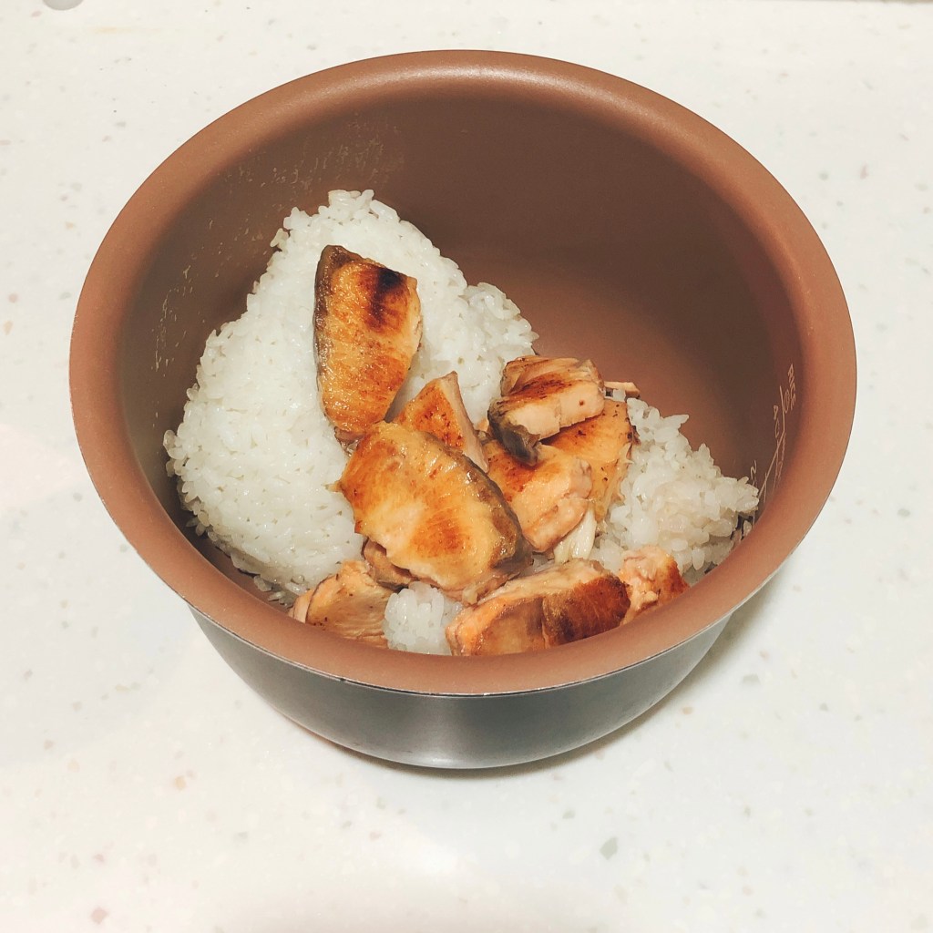 等待白飯的同時,將退冰的新鮮鮭魚排用廚房紙巾擦乾,撒上一點鹽抹勻放置5分鐘。熱油鍋後將鮭魚排煎至黃金色,起鍋放到盤子上待稍微冷卻去除鮭魚骨頭。