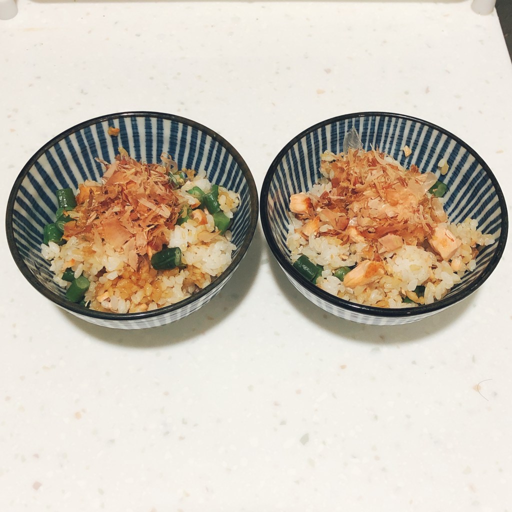 雖然【深夜食堂】裡的貓咪飯是簡單使用柴魚片,如果覺得澎鬆的柴魚片無法滿足煮婦煮夫飢腸轆轆的胃,也可以加入油煎鮭魚拌入白飯裡,增添飽足感的同時補充優秀蛋白質及油脂。