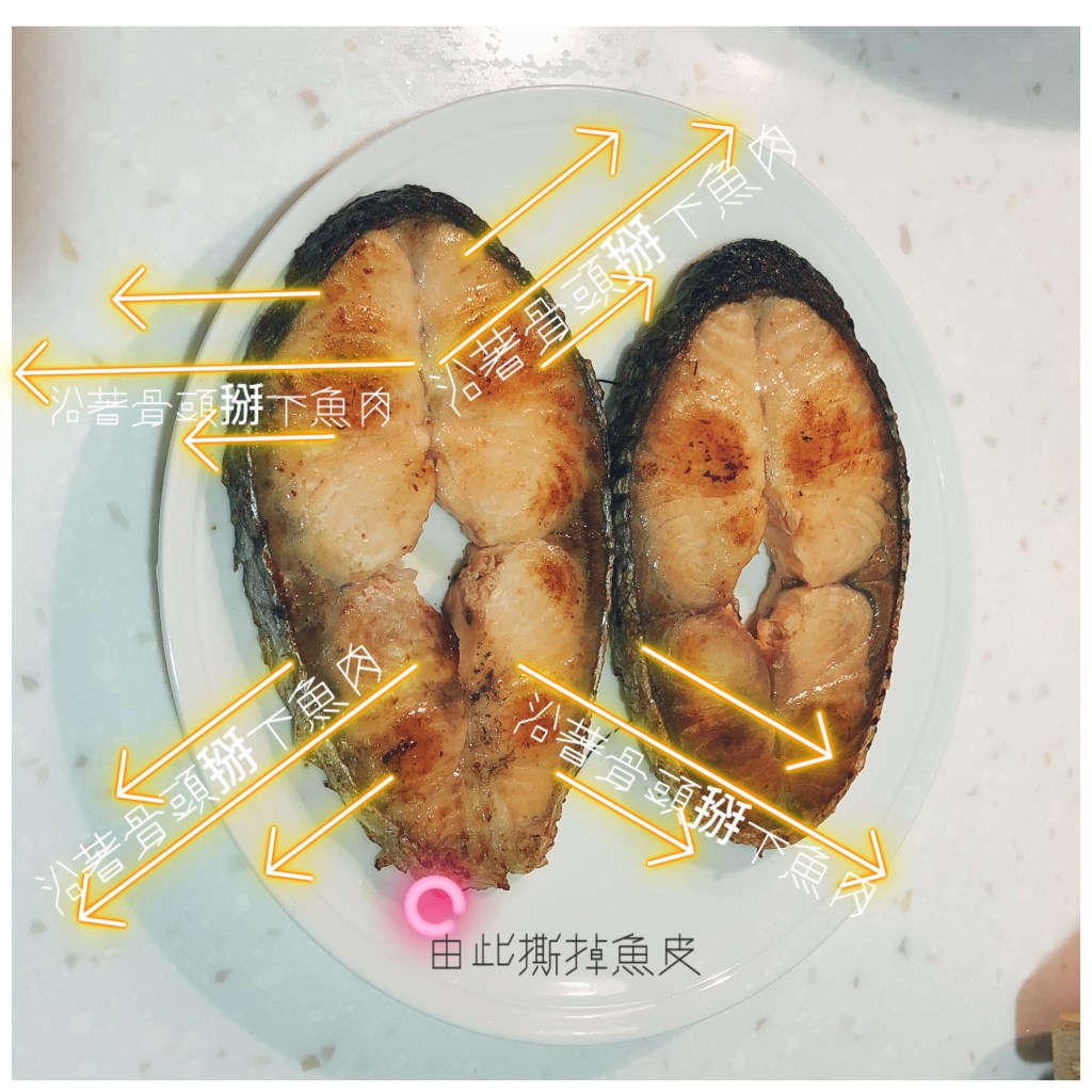 比起生鮭魚、煎熟的鮭魚更好剔除骨頭。首先,先用手撕開煎至焦脆的鮭魚皮,接下來順著大骨頭邊緣用筷子掰下鮭魚肉,拌入煮好的白米飯。