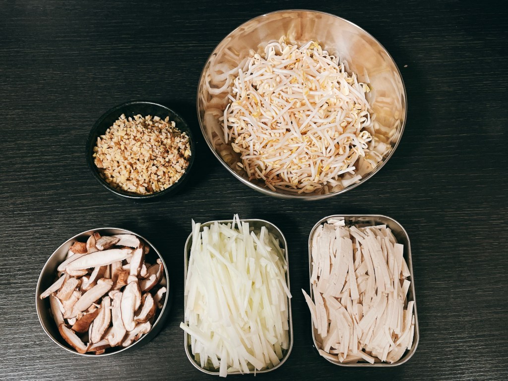 先把有機生薑(100g)削皮後切成小丁薑末,豆芽菜(200g)拔除根部備用。接下來以豆芽菜的長度和粗細為基準,把鮮香菇(100g)、削皮後的大頭菜(200g)、AH豆腐(300g)切成細絲