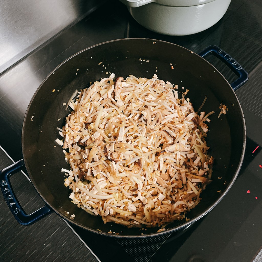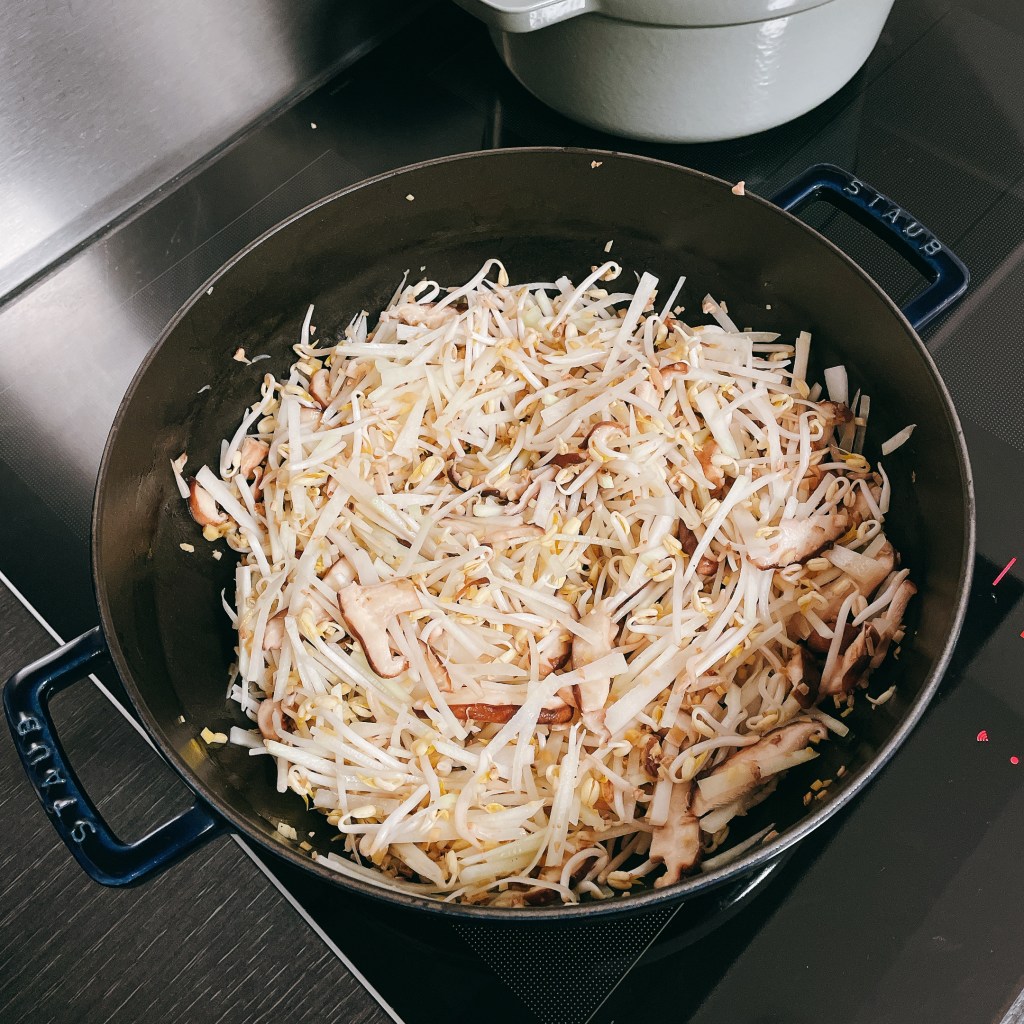 接下來加入大頭菜絲(300g)、鮮香菇絲(100g)、豆芽菜(200g)拌炒到蔬菜條出水,