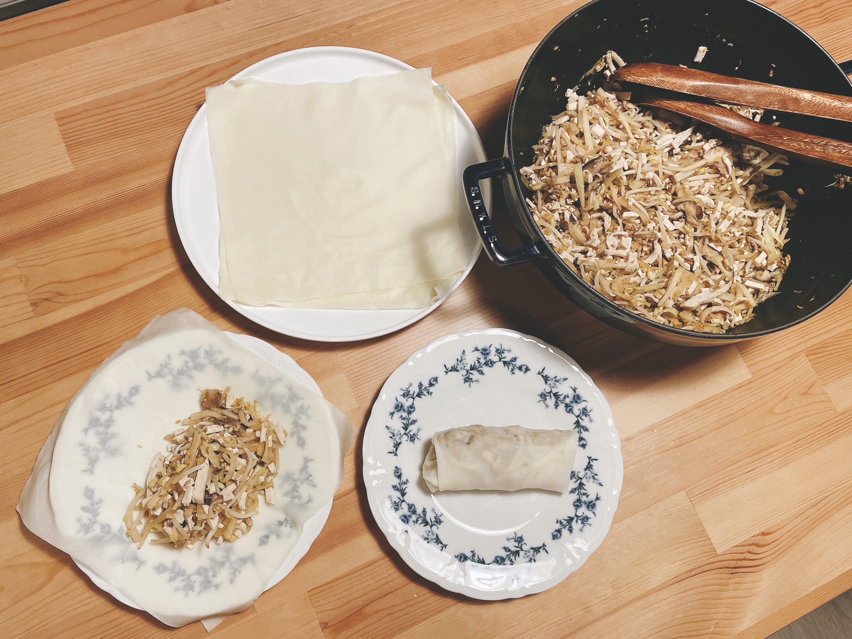 移居荷蘭後,我們也把這道『家宴』帶進荷蘭餐桌上。每逢清明時節我和半獸人先生都會一起準備這一味:以生薑為主調,搭配白豆乾絲、大頭菜絲、鮮香菇絲以及豆芽菜,簡單加入醬油、鹽巴炒香,再快速蒸幾片春捲皮包起來,充滿個人特質的『半獸人家風』福州潤餅,完成。