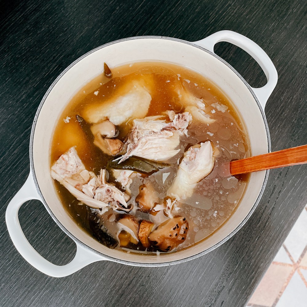 以前我婆婆都是準備甜滋滋的龍膽石斑台式味噌湯但半獸人先生不喜歡;我則是準備剝皮辣椒雞湯或胡椒蒜頭雞湯居多。潤餅遵守的是一代傳一代的家風口味,但要如何準備配潤餅的湯就是掌廚煮婦的自由啦!