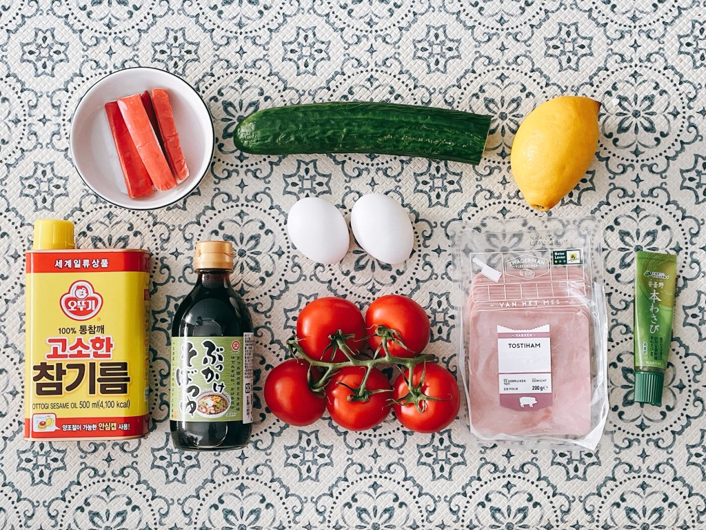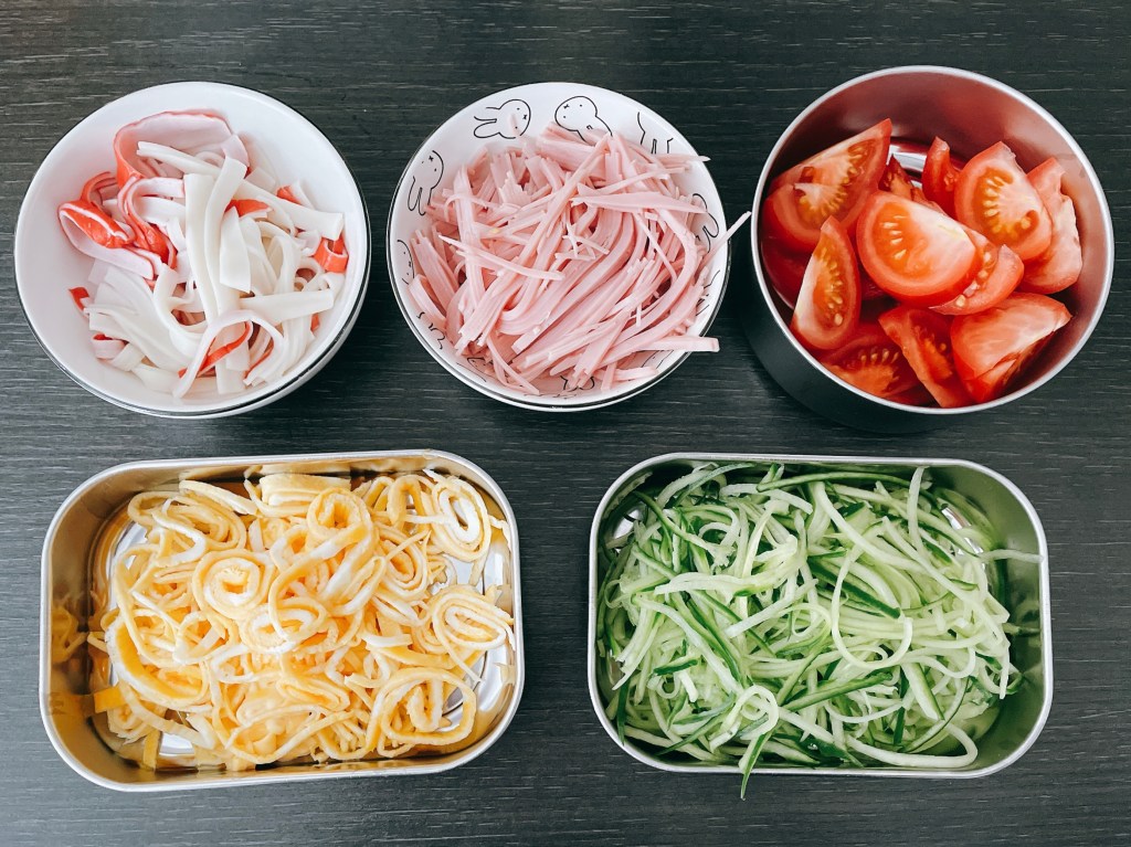 蟹味棒(4條)滾水煮1~2分鐘後,手撕成細條。番茄(2顆)去除蔕頭後切瓣、小黃瓜(1條)挖除中間帶籽果肉後刨成細絲、火腿(5片)切細絲;接著煎雞蛋(2顆)一樣切成細絲,