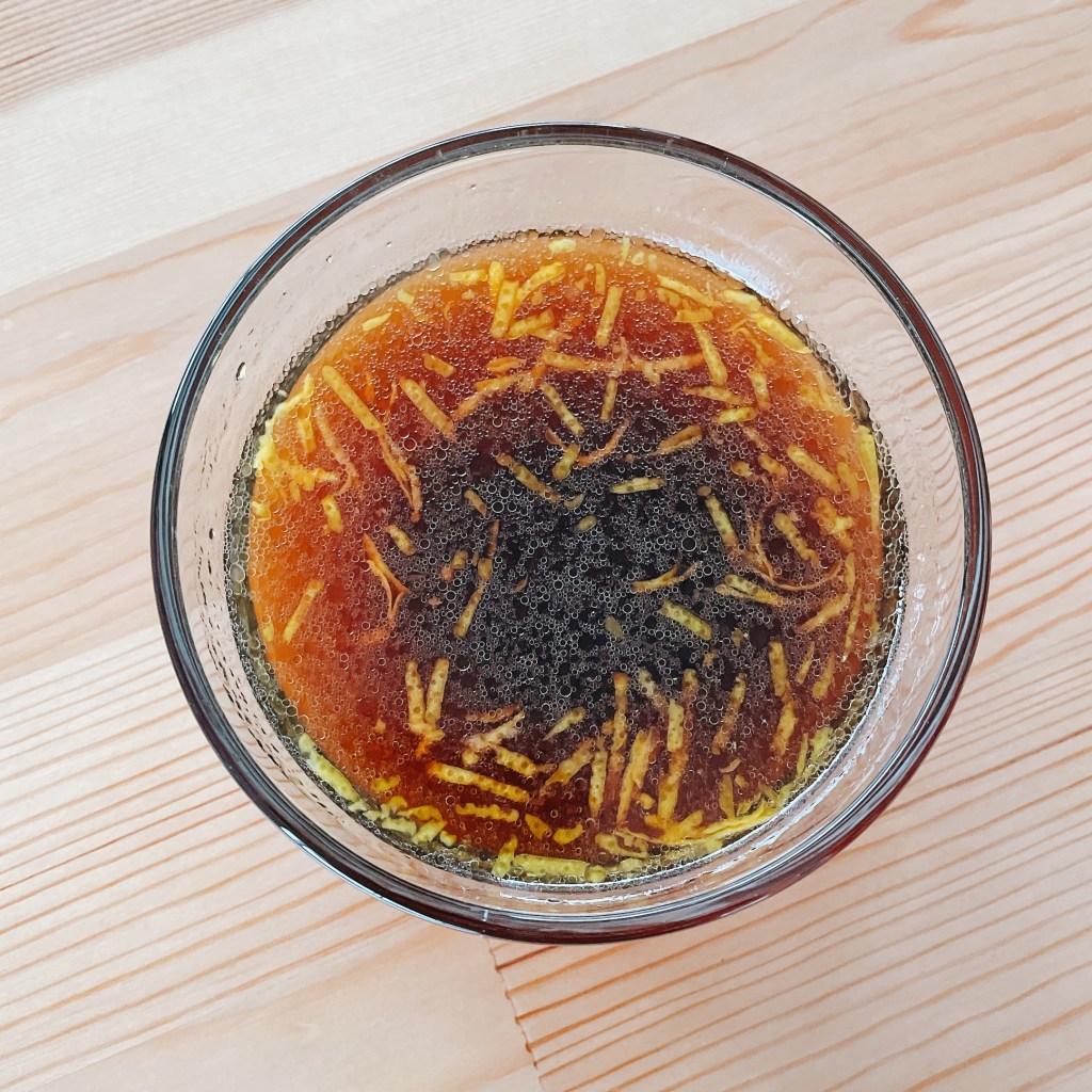在容器內加入小豆島涼麵露(150ml)、檸檬汁(1大匙)、芝麻油(1茶匙)以及新鮮檸檬皮(適量)增添香氣,道地(?)日本『中華涼麵』靈魂醬汁準備完成。