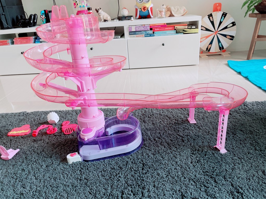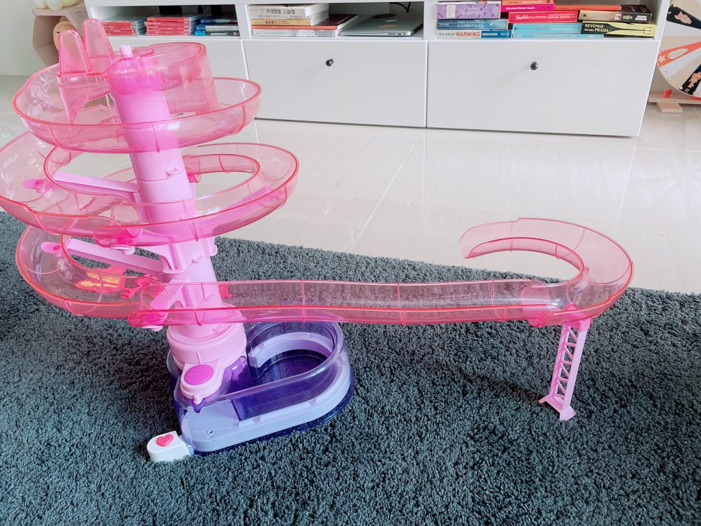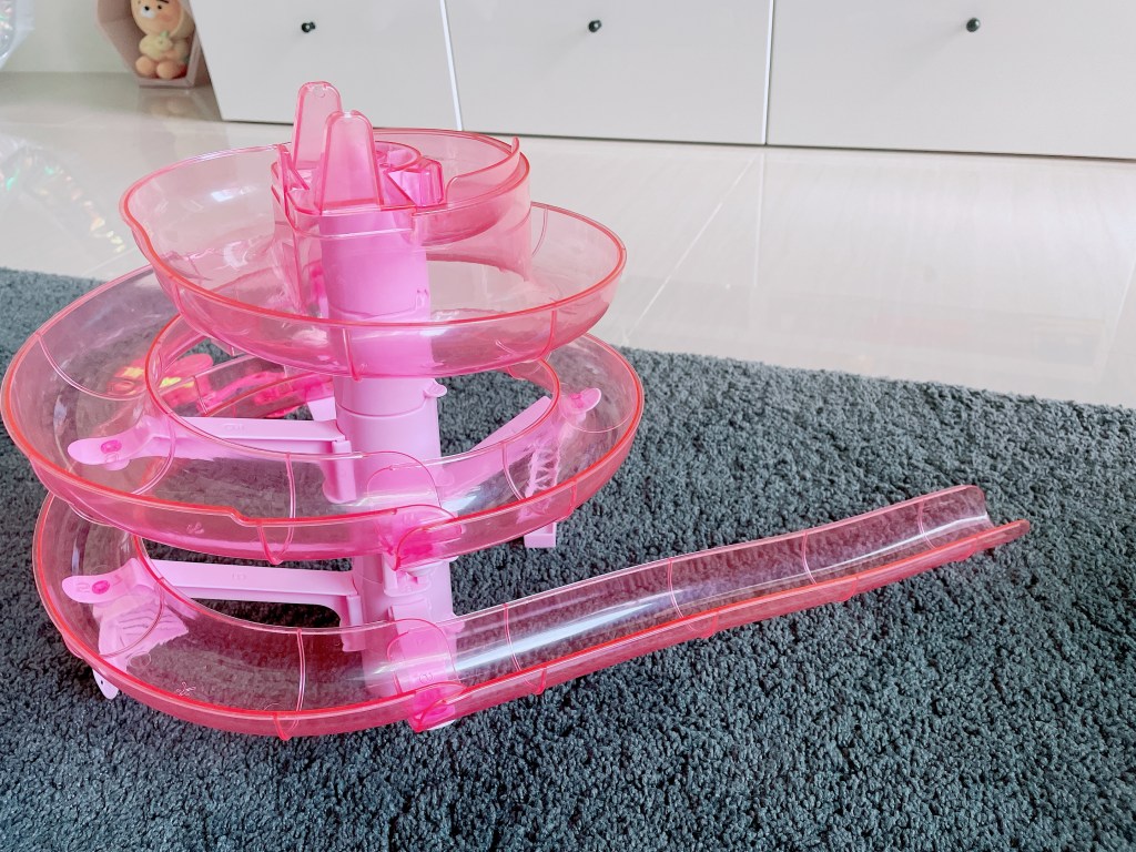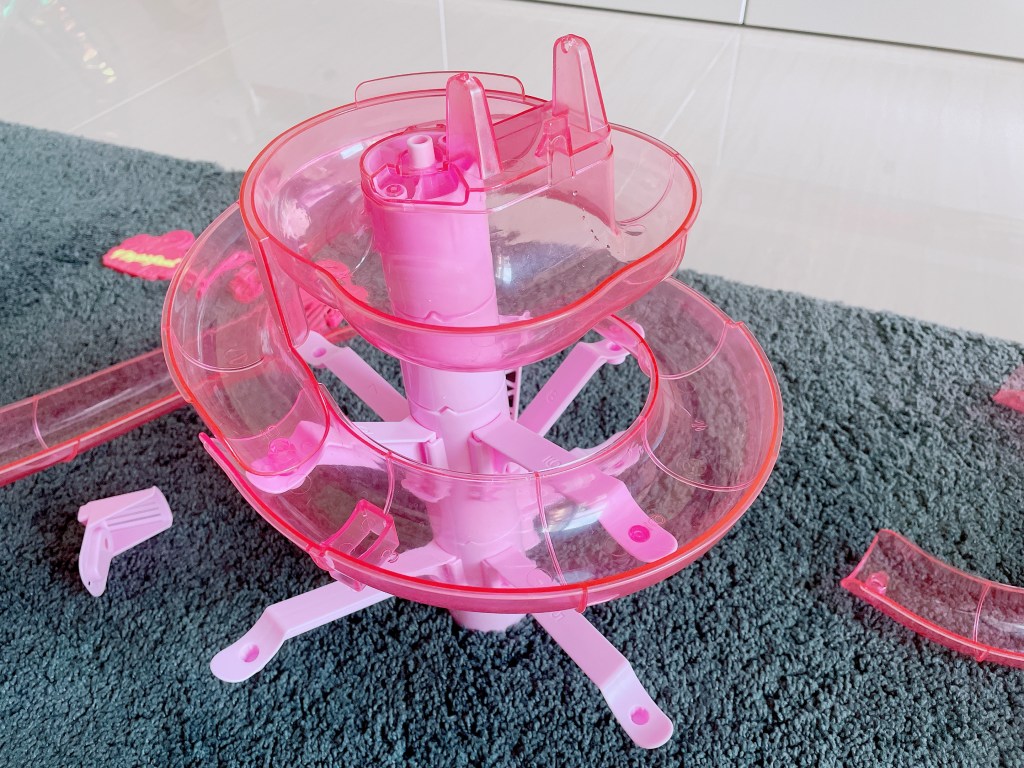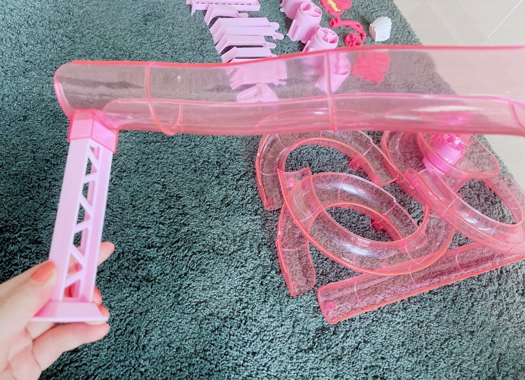 接下來,從頂端開始把透明的滑水道軌道依序接起來