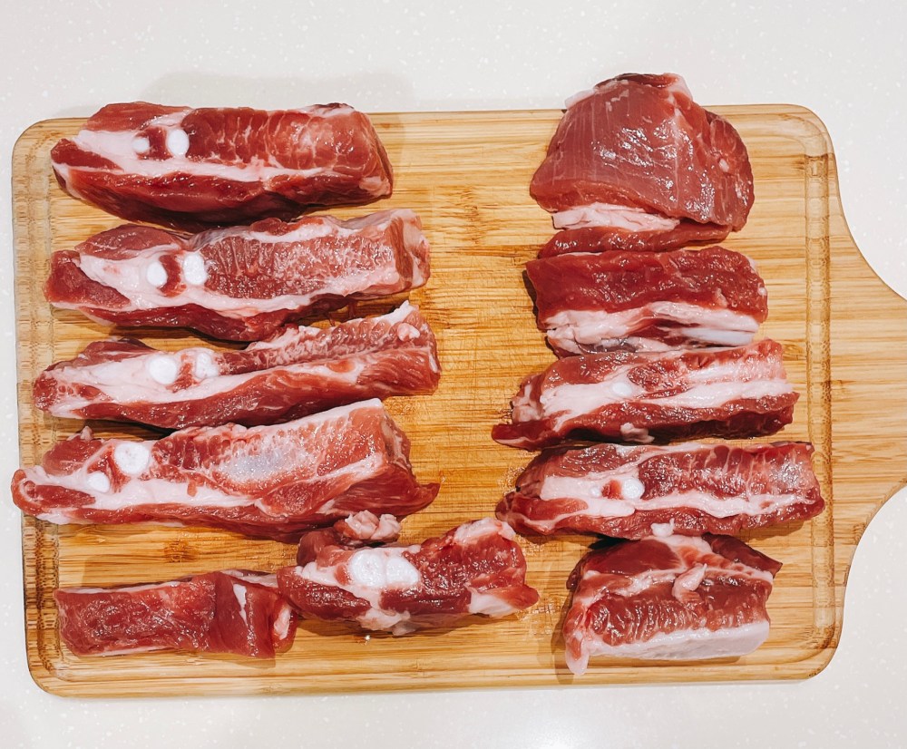 先將新鮮豬肋排(1公斤)沿著骨頭依依切成條狀,
