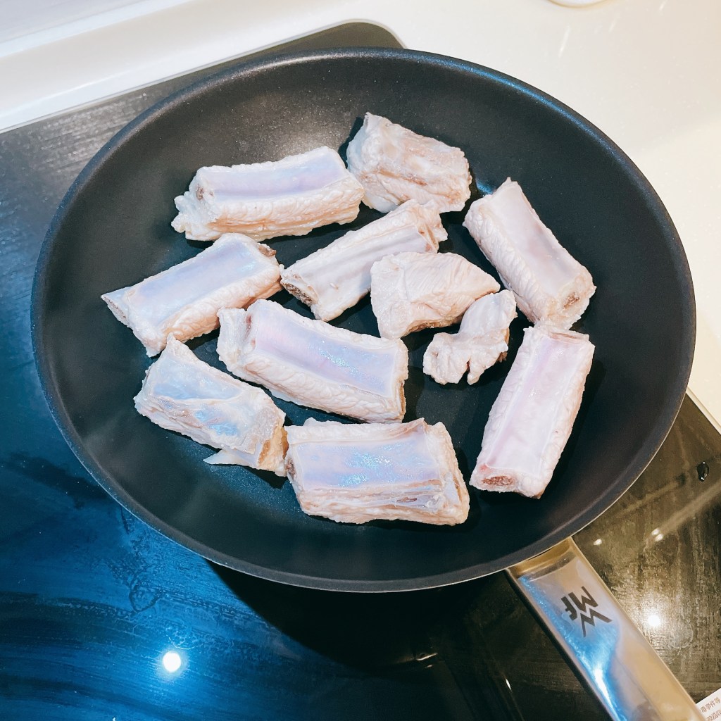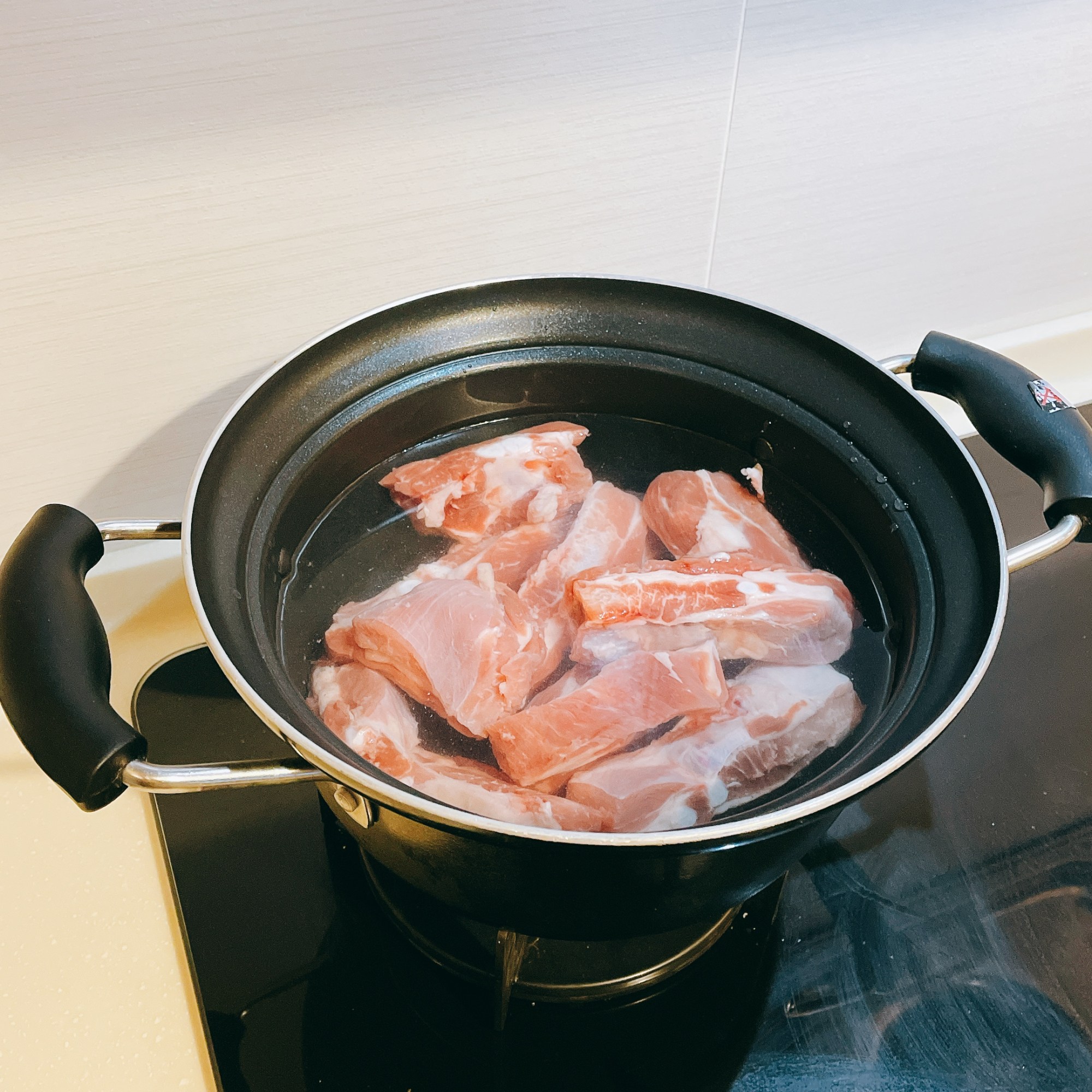 接下來在水(500ml)中將豬肋排煮到水滾,將豬肋排撈起來沖掉肉末殘渣,備用