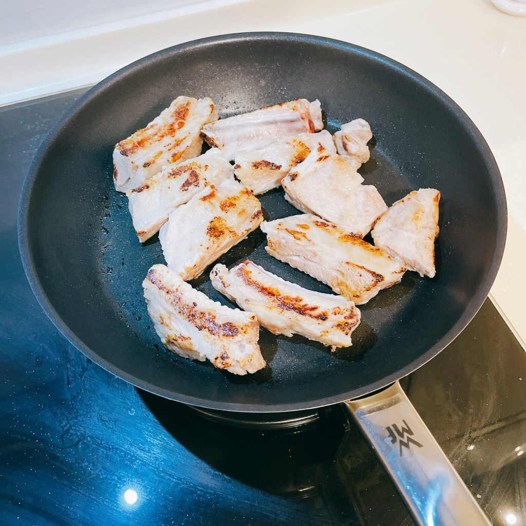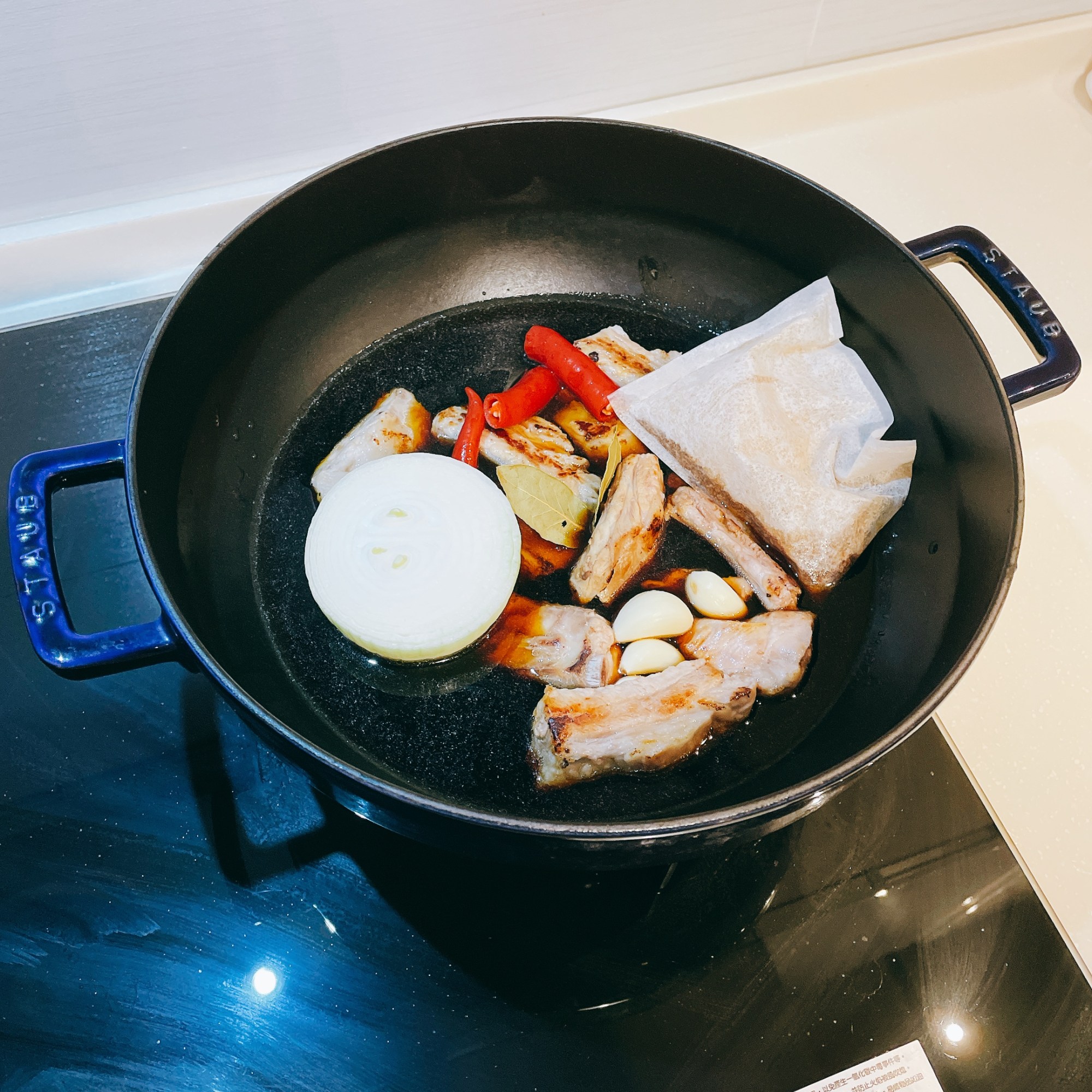 表面上色後,加入燒酒(1大匙)增加香氣,並將豬肋排肉塊剩下三面都煎到上色,就能移駕鑄鐵鍋開始進行第一次燉煮。