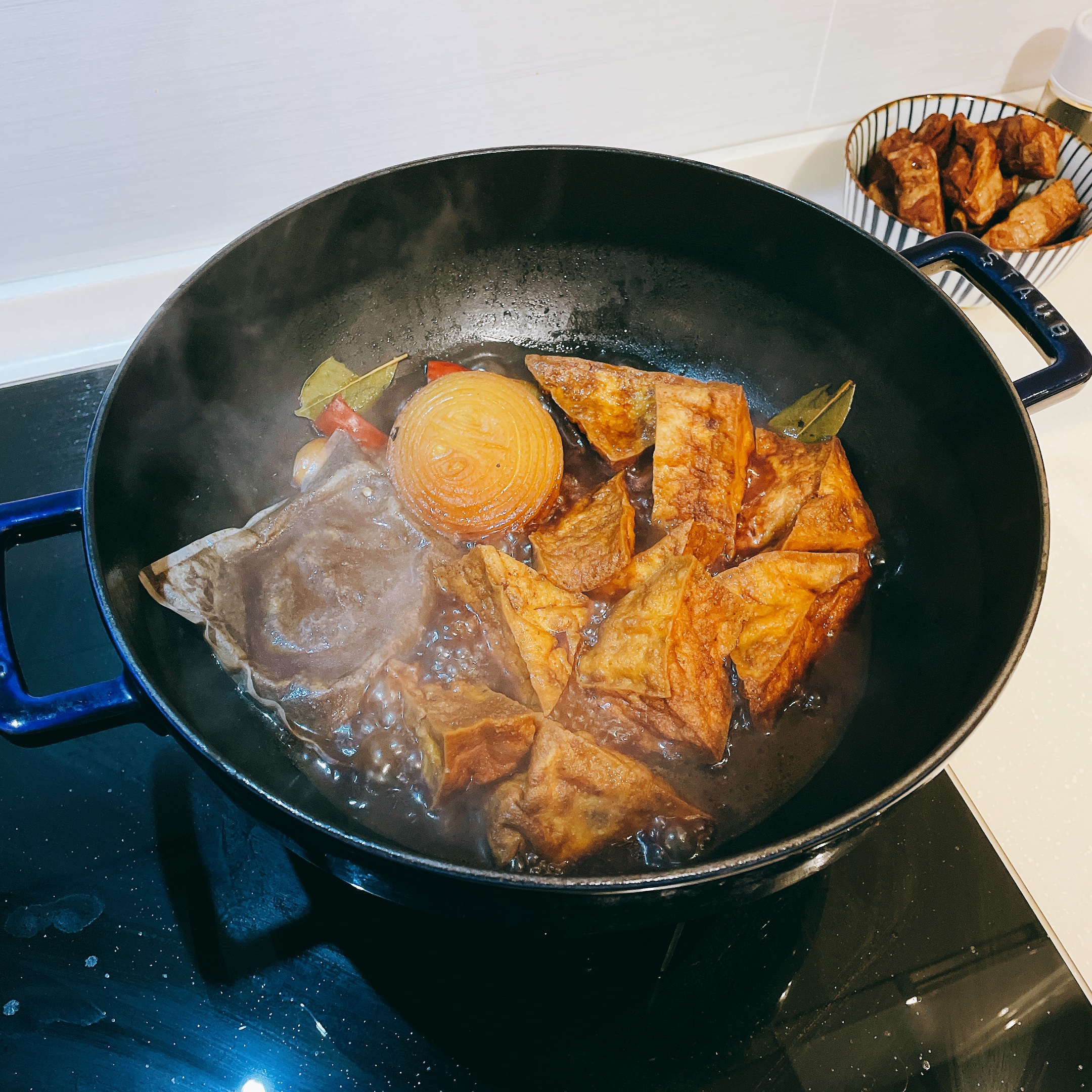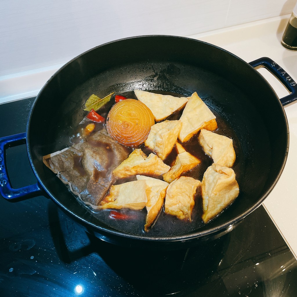 最後加入容易廣納百川的醬汁載具油豆腐(10塊)水(100ml),煮滾後蓋鍋蓋煨煮5分鐘