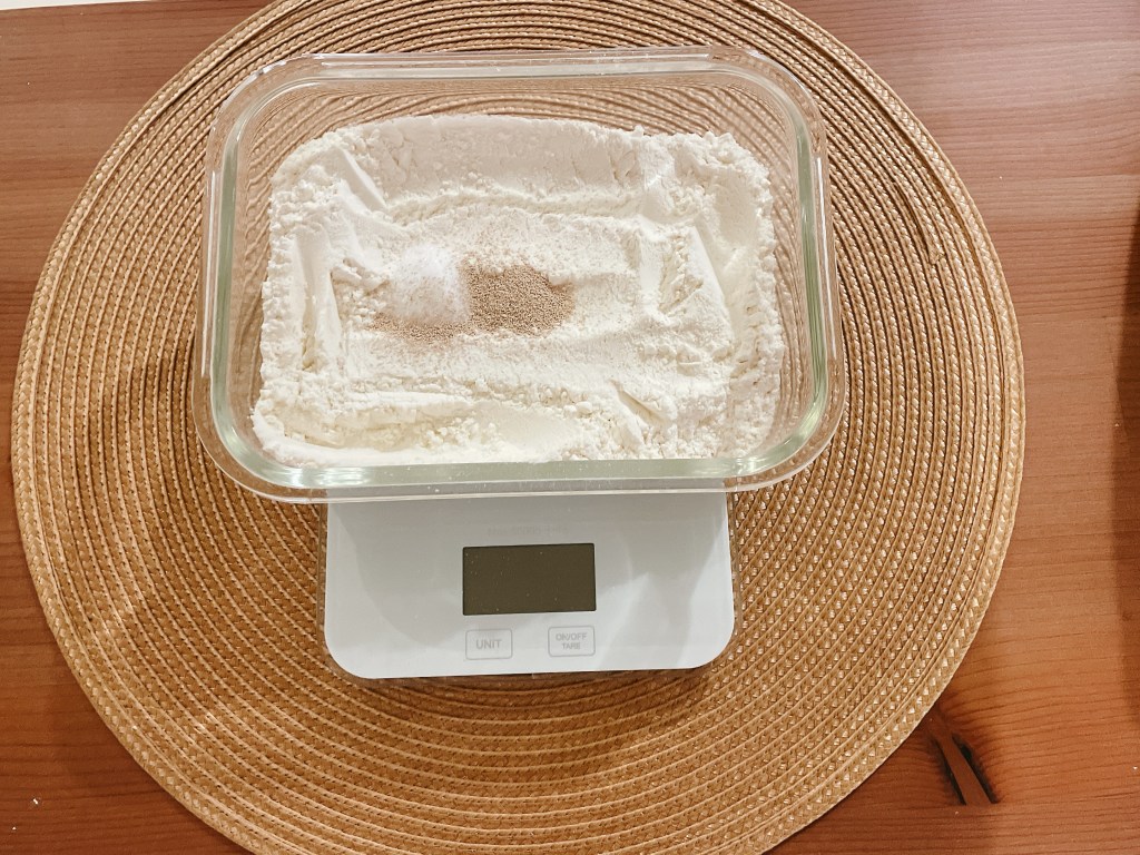 直接用樂扣玻璃盒做為容器,用電子秤與量匙精準量測高筋麵粉(200g)速發酵母(1茶匙)鹽巴(2茶匙)