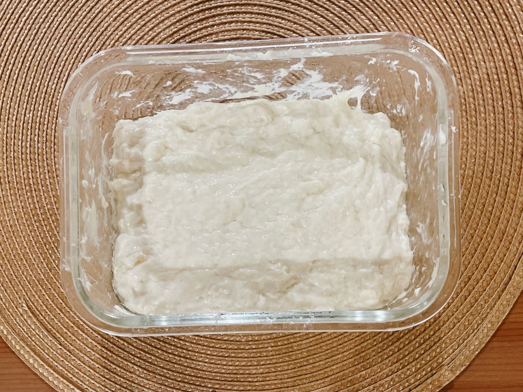 加入橄欖油(15ml)用抹刀將油與麵團拌勻、稍微調整麵團形狀鋪平整個玻璃樂扣盒子,