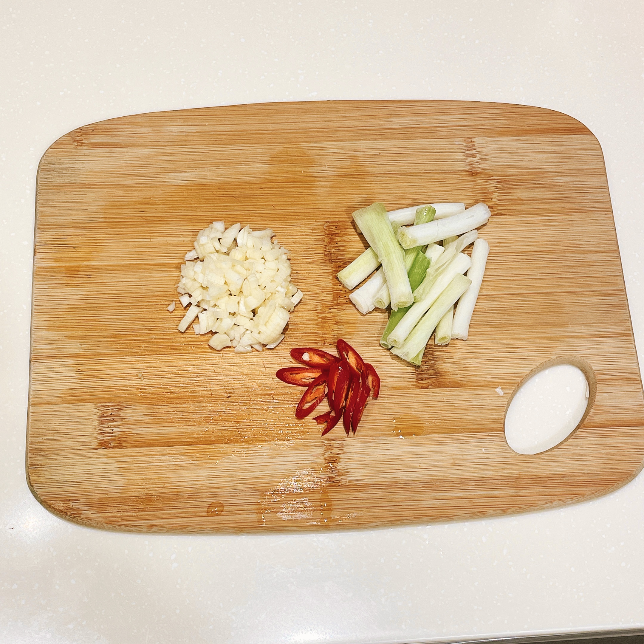 將青蔥(1把)蔥白的部分切斷、蔥綠的部分切成蔥花。蒜頭(半球)去皮剁成碎末、紅辣椒(1根)切成小段,備用