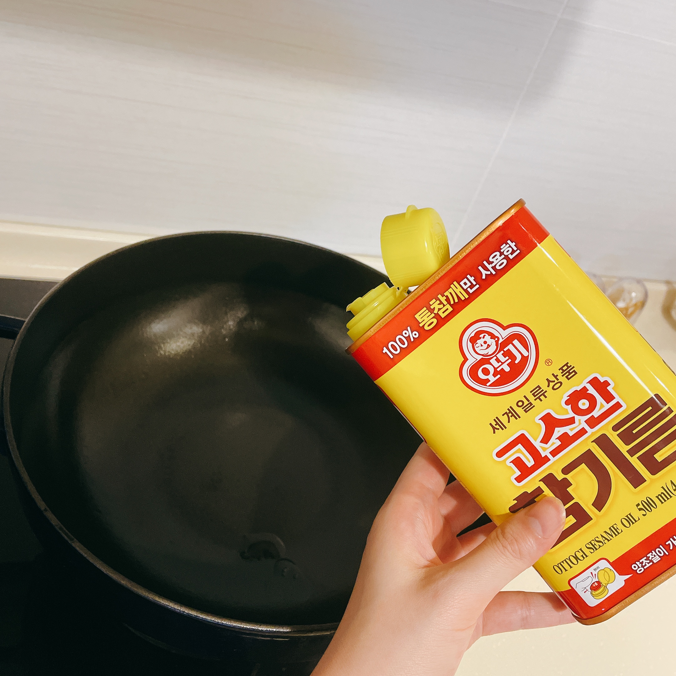 小火加熱STUB鑄鐵鍋、倒入芝麻油(適量讓豬五花不要黏鍋子),用手感受鍋子上方溫度(手心感到暖暖的)再放入帶皮豬五花(200g),