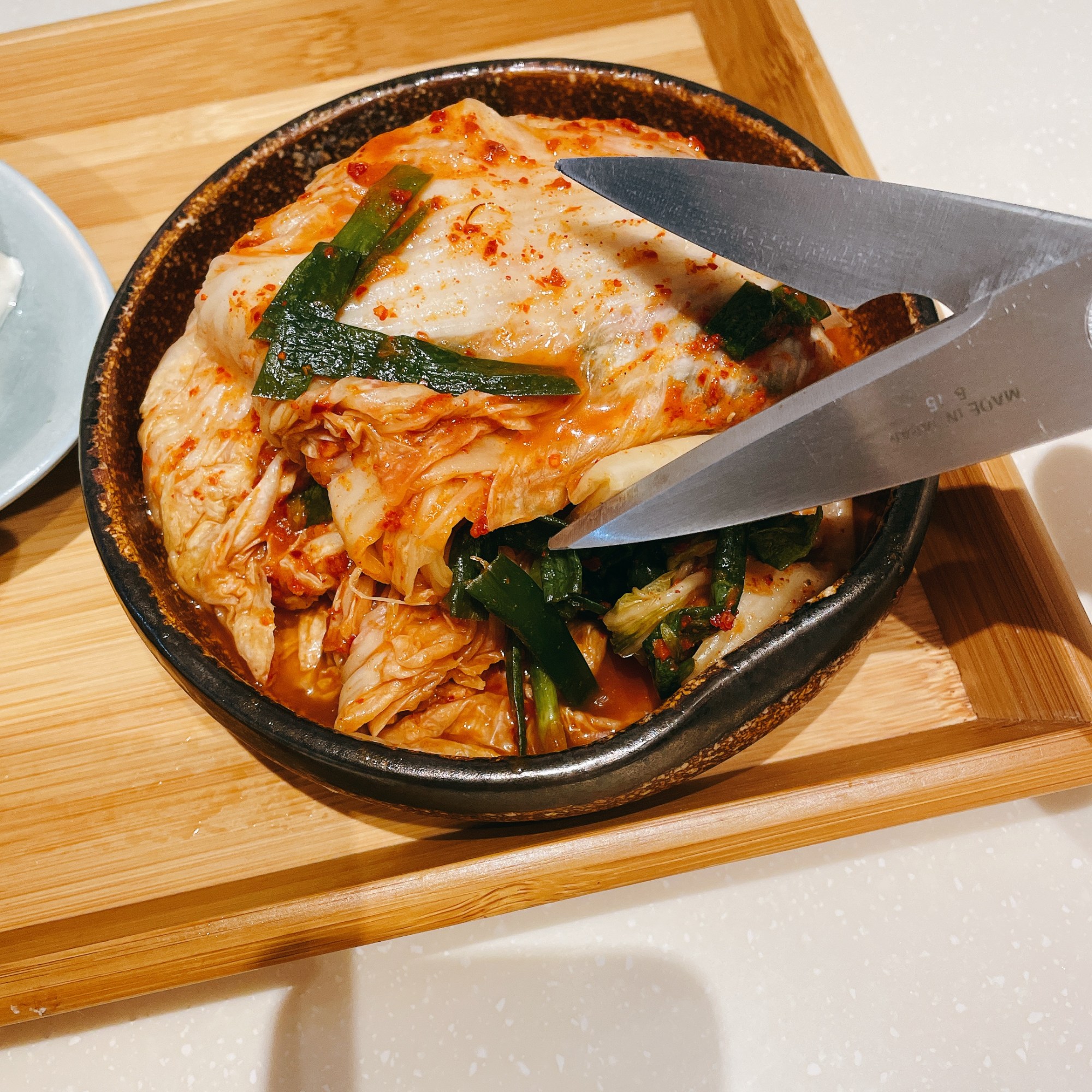 將泡菜(1/4顆)從保鮮盒中取出並用食物剪刀輔助剪成方便入口的大小。