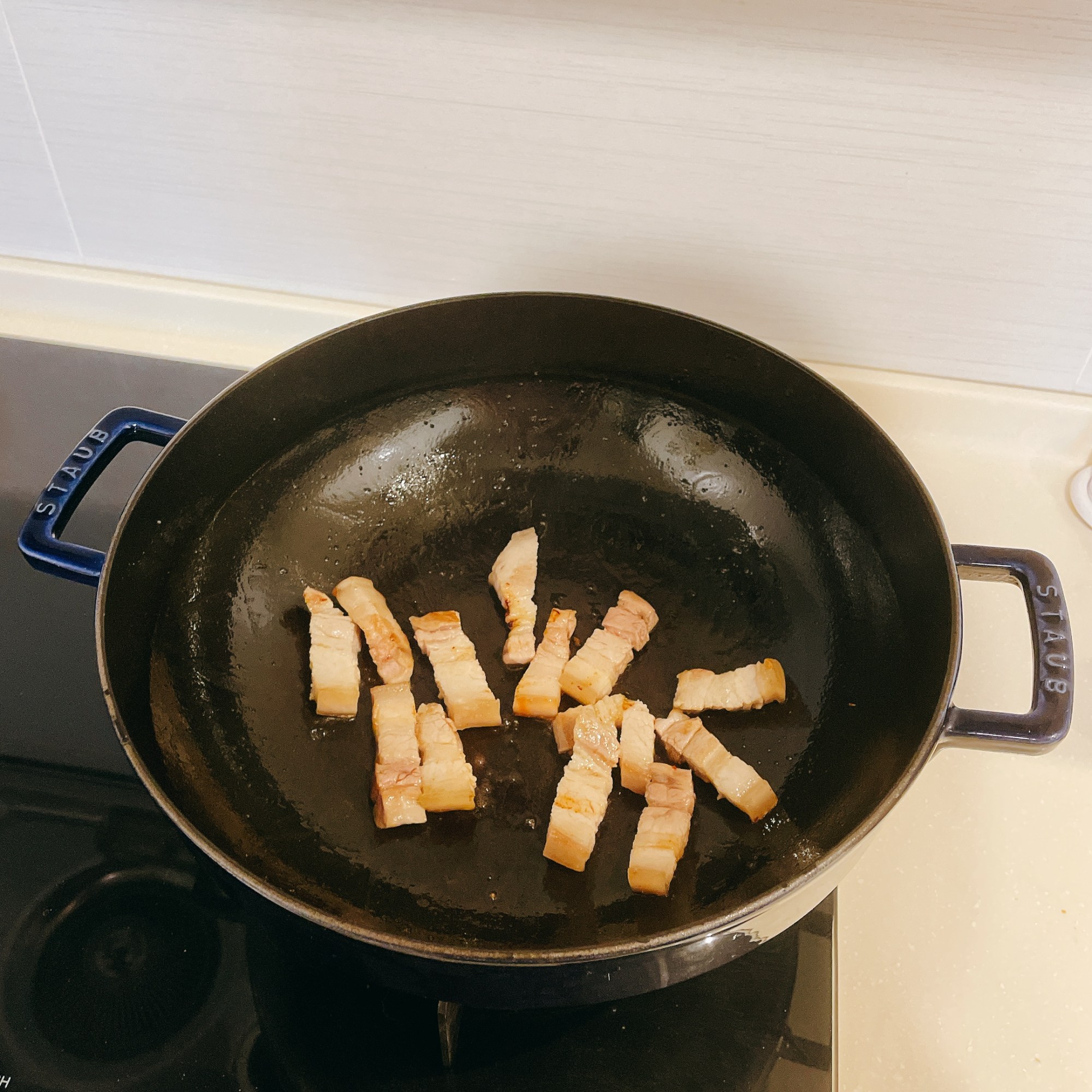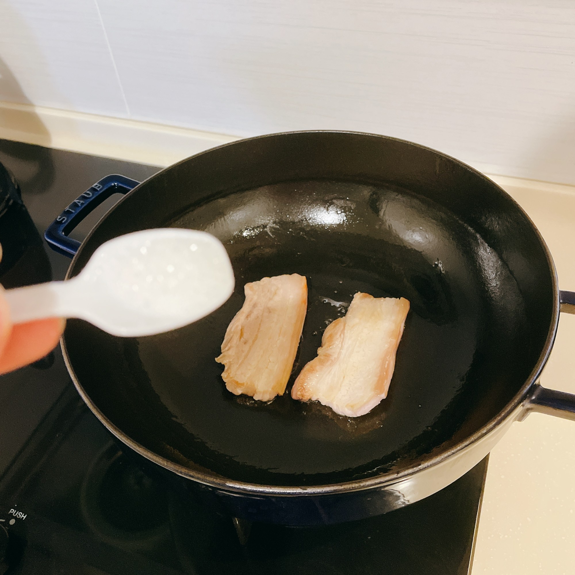 將豬五花雙面煎到略帶黃色並撒上砂糖(1茶匙)輔助炙烤豬五花表面焦糖化,接著出動食物剪刀把五花肉剪成容易入口的大小,