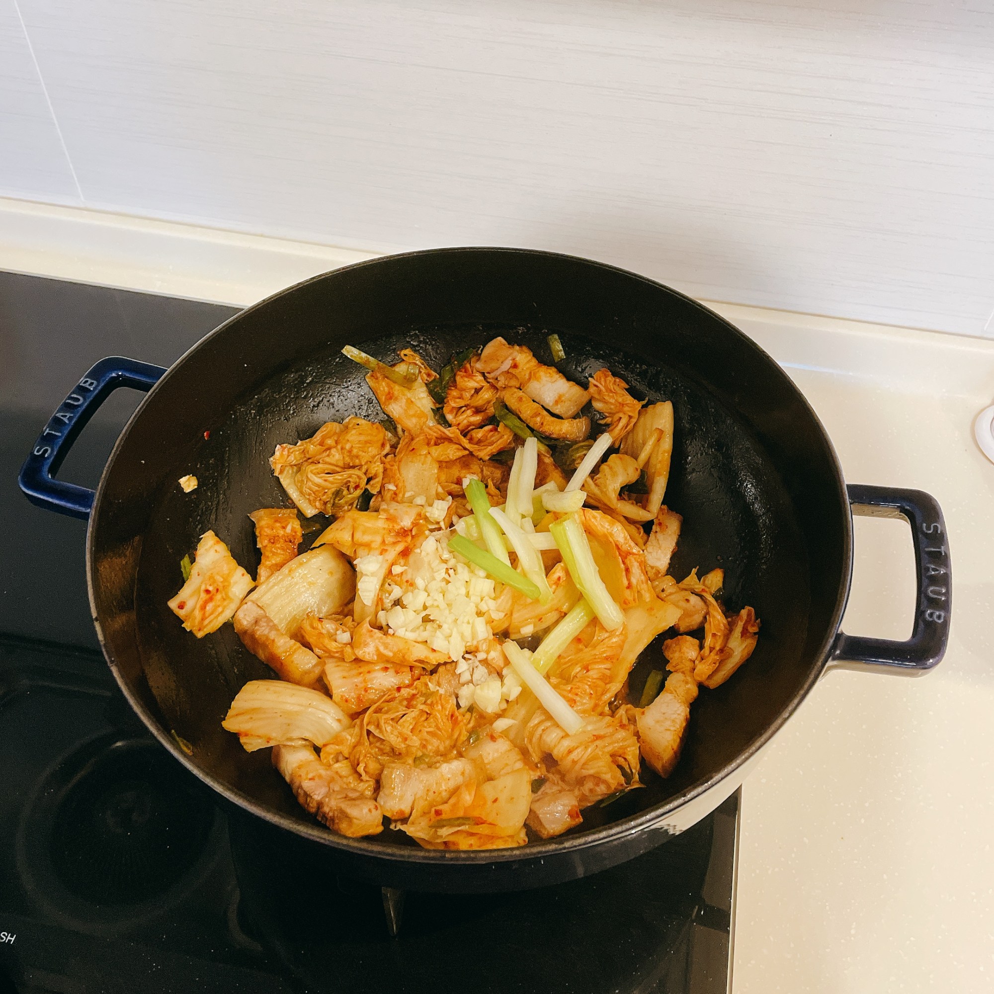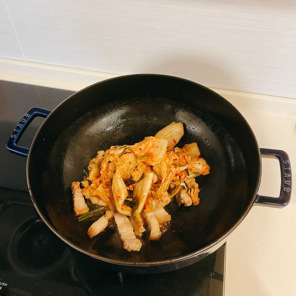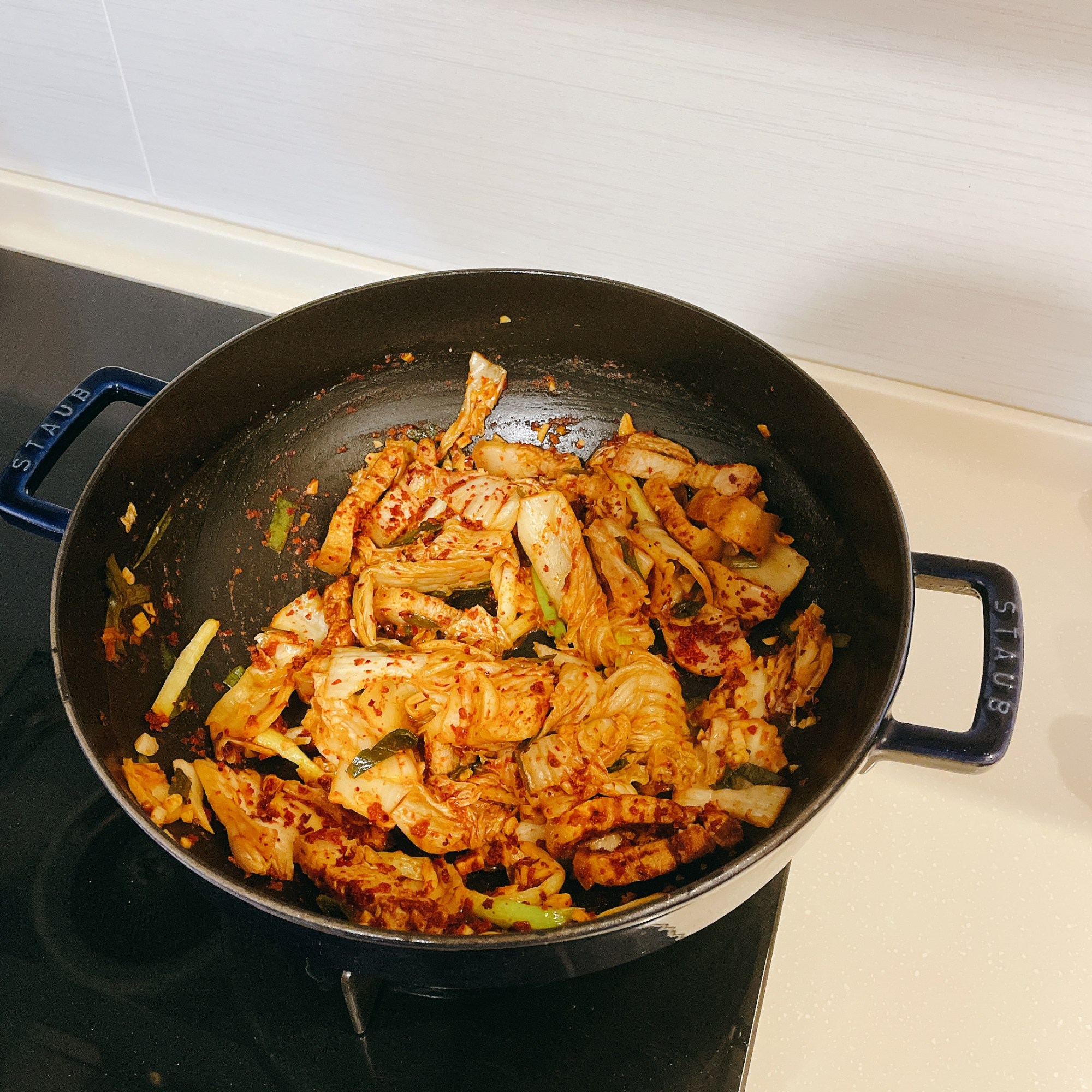 接著倒入剪好的泡菜,持續翻炒到香氣四溢;炒過的泡菜再燉煮味道會更上一層樓喔!