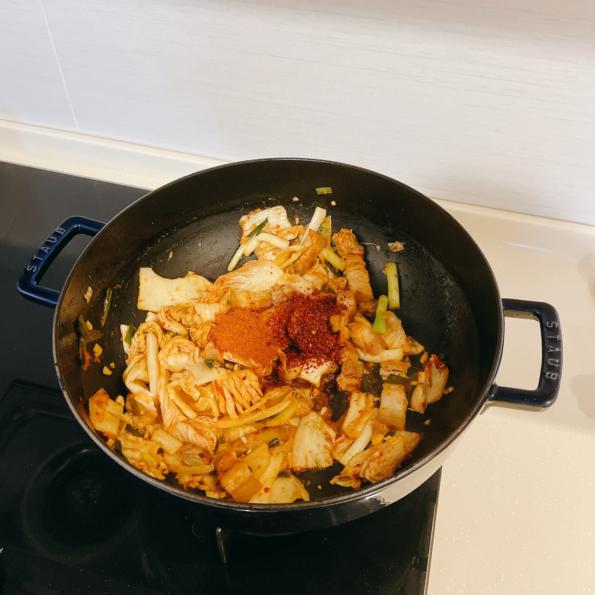 緊接著加入辛香料蒜末(半顆)、蔥白段(20g)稍微翻炒後,再添加細辣椒粉(2大匙)、粗辣椒粉(1大匙),將所有的泡菜鍋夥伴拌炒均勻,