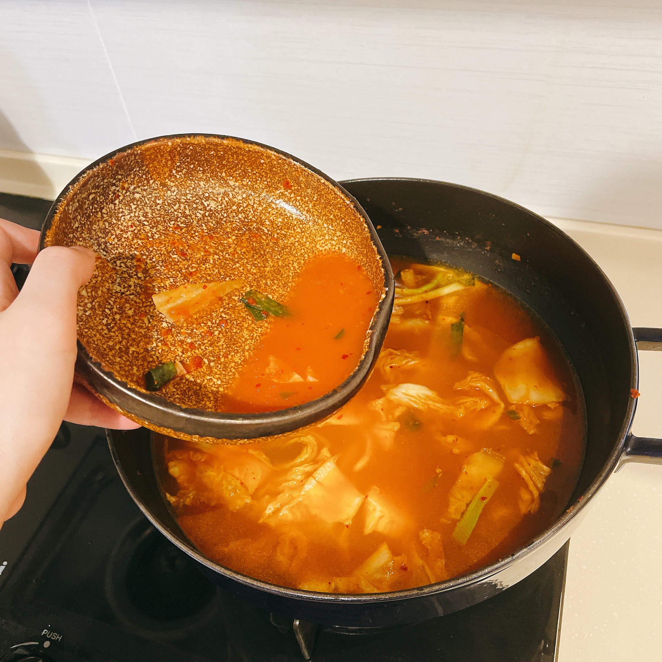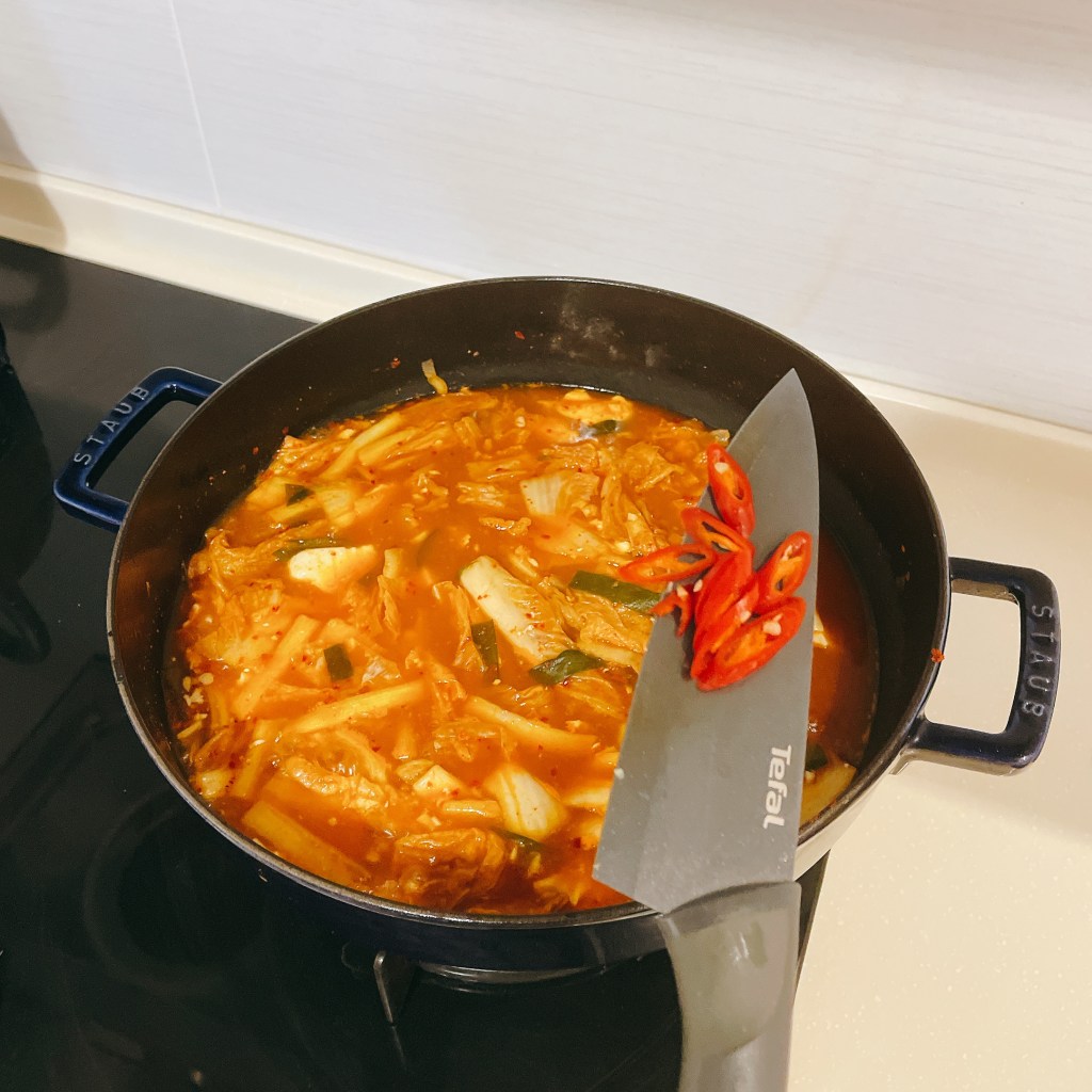 記得稍微用大湯匙撥開嫩豆腐即可,煮到泡菜湯稍微濃稠後,加入切好的紅辣椒(1根)和蔥花(50g),酸味十足的豬肉泡菜豆腐鍋就完成囉!