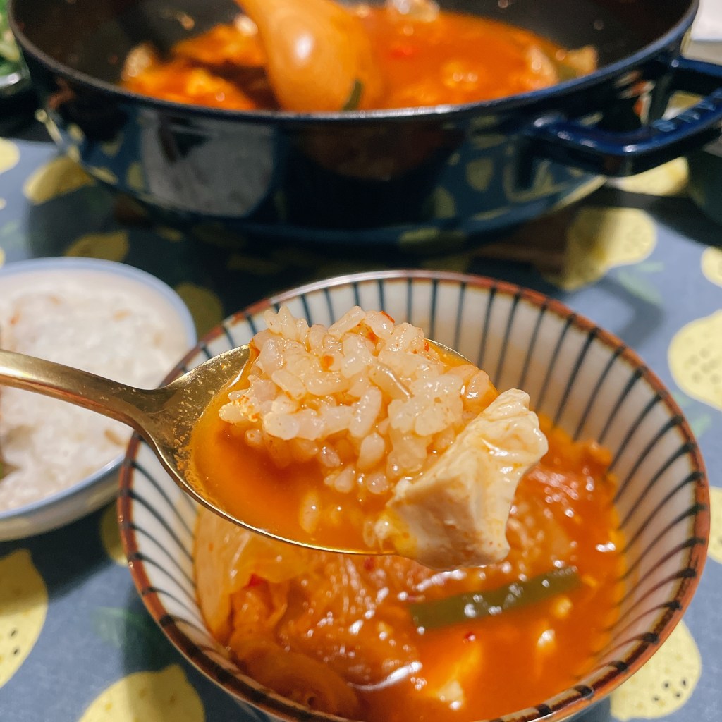 身為天生吃貨一定要另外準備一個大碗公,先裝豬肉泡菜豆腐湯至8分滿,再將白飯倒入碗公中,這樣白米就能完美吸收美味的湯汁精華,再用湯匙舀一口熱乎乎火辣辣的泡菜湯和嫩豆腐大快朵頤。豬肉泡菜豆腐湯真的擁有不分四季都能完美完食的紅色魔法!