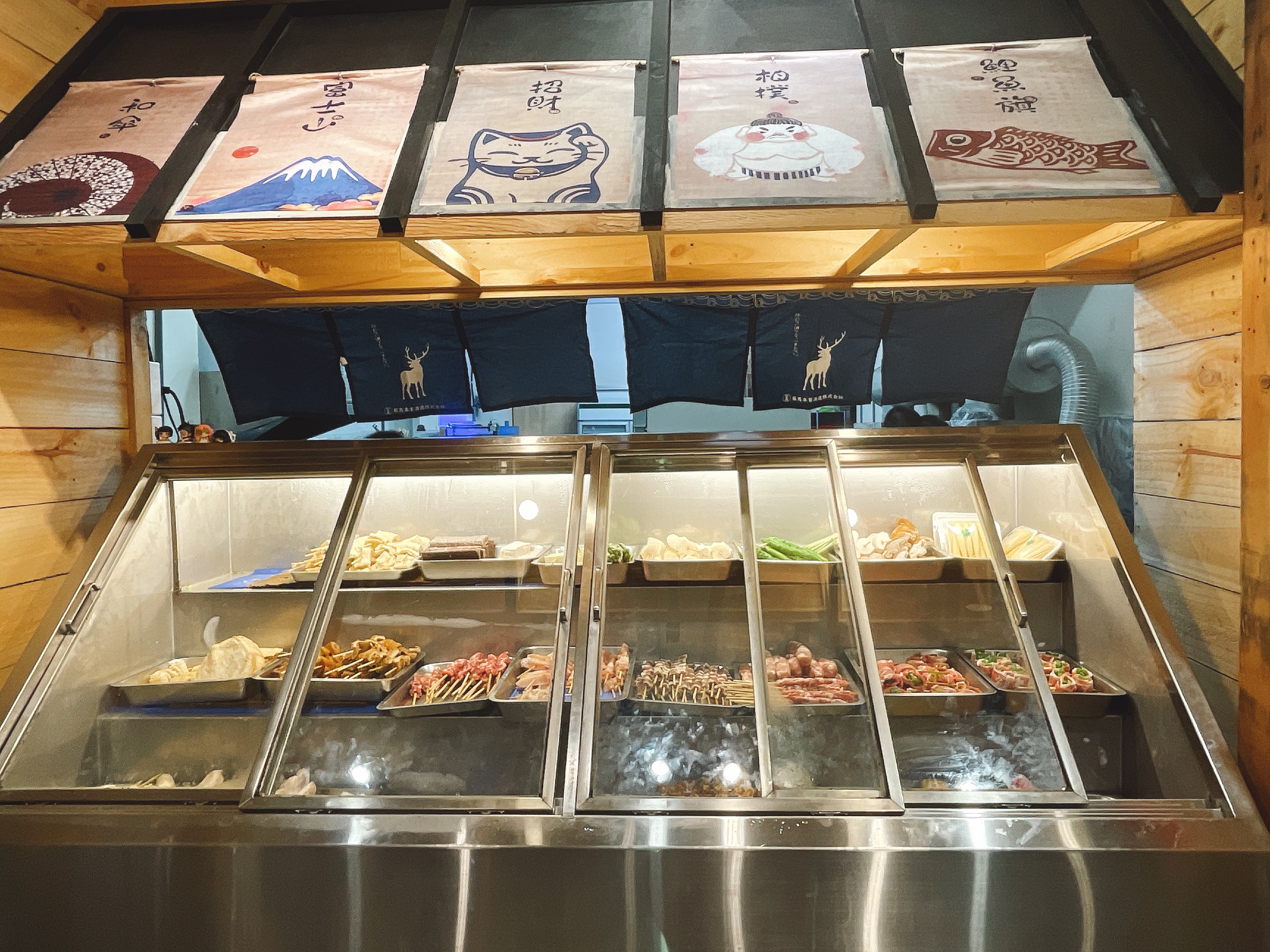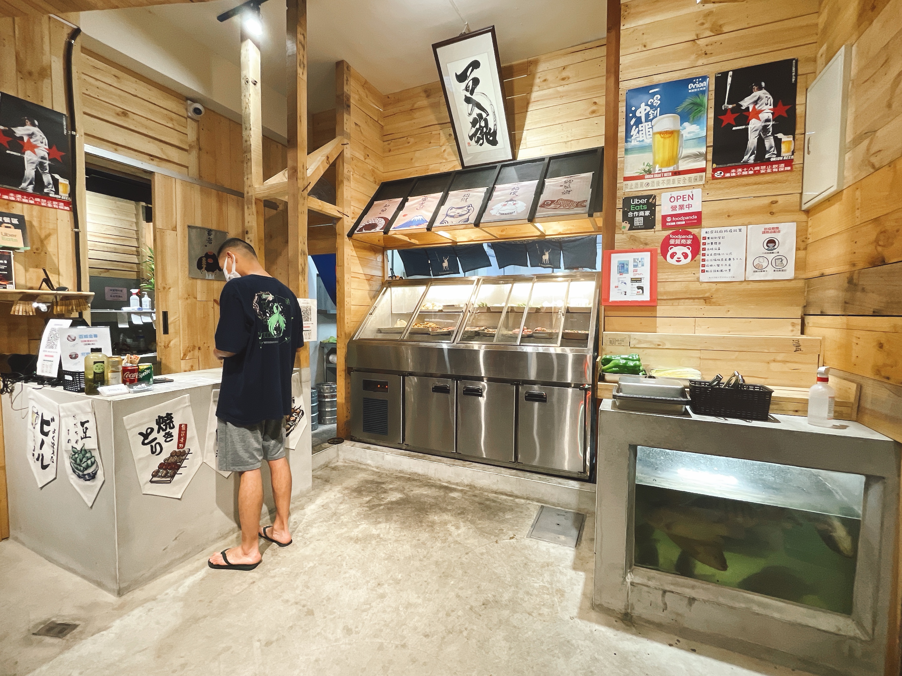 掃完防疫1922 QRcod足跡、手部消毒後,可以拿托盤自行打開透明冷藏櫃夾取串燒食材;若是烤魚/海鮮類則是結帳前直接跟櫃檯點餐即可。